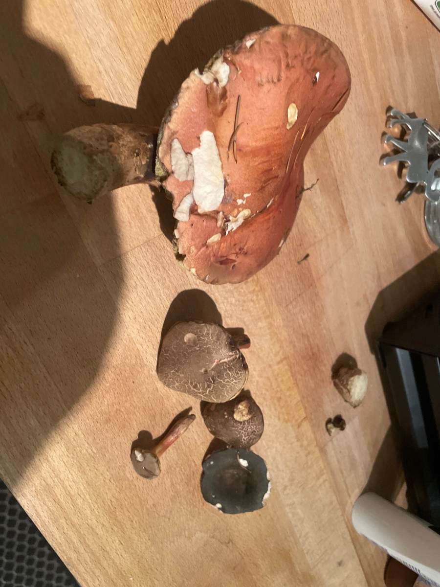 Ich habe jetzt 2 Bücher und 10 Videos zu Frauentäubling vs grüner Knollenblätterpilz geguckt. Kein Kuchenstück-fömiges abziehen der Huthaut, keine Knolle kein Ring, Lamellen direkt am Stiel beginnend, violette Huthaut, elastische Lamellen etc, also es muss ein Frauentäubling sein, jedenfalls kanns kein Knollenblätterpilz sein. Ich denke ich probier den kleinen mal.