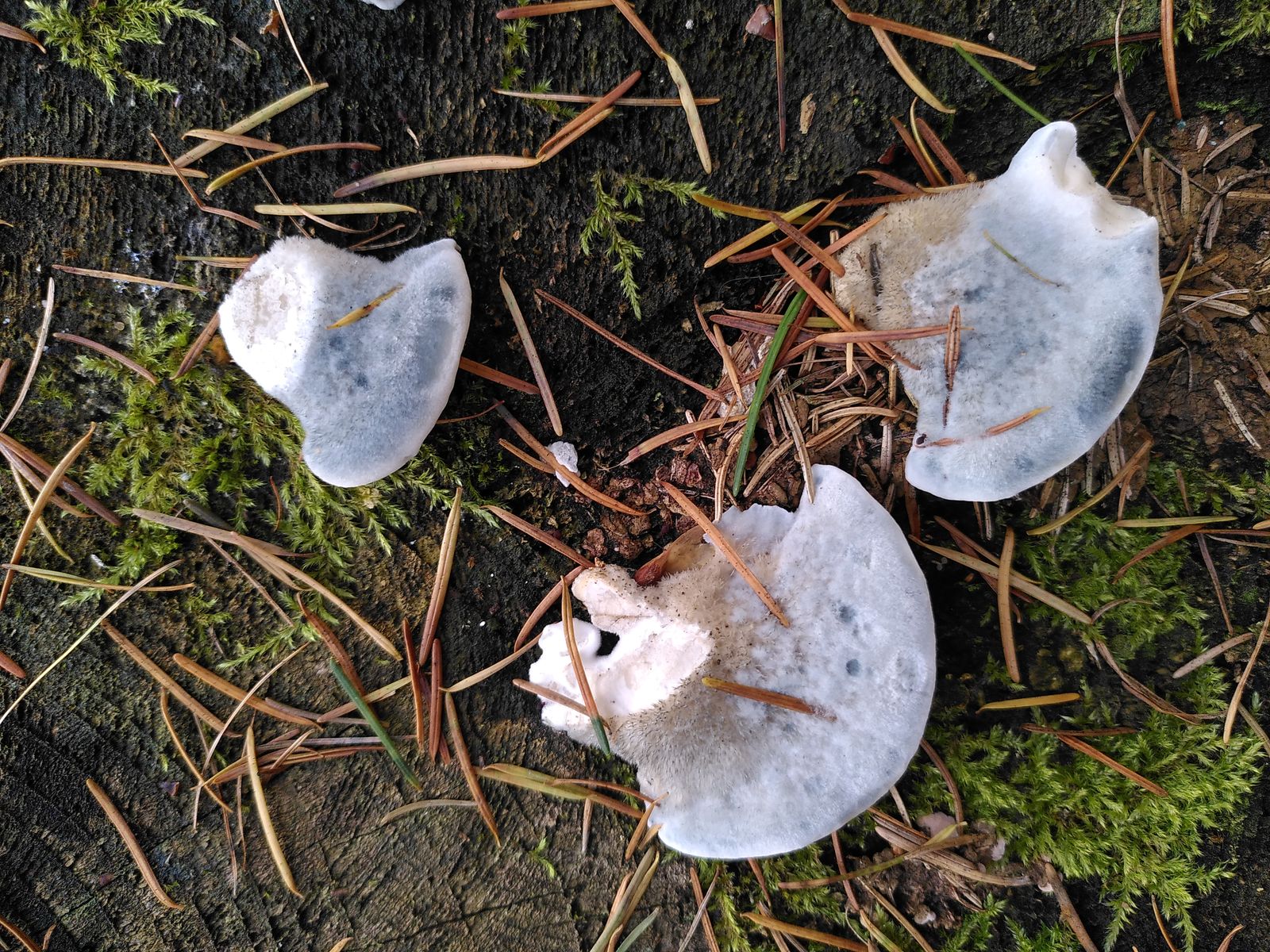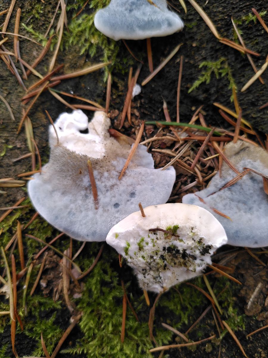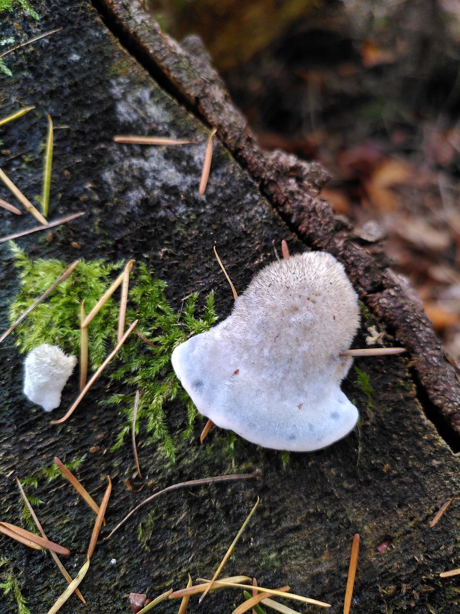 heute war ich in einem Fichtenwaldstück unterwegs und habe auf einem Stumpf diese hübschen behaarten Porlinge entdeckt. Über Bestimmungsvorschläge würde ich mich freuen. Einen besonderen Geruch habe ich nicht feststellen können. Die Oberseite war blaugrün und dicht behaart, zur Anwachsstelle hin braun. Die Unterseite war weiß mit feinen Poren. Das Fleisch war weiß und zoniert (auf dem letzten Bild zu sehen).