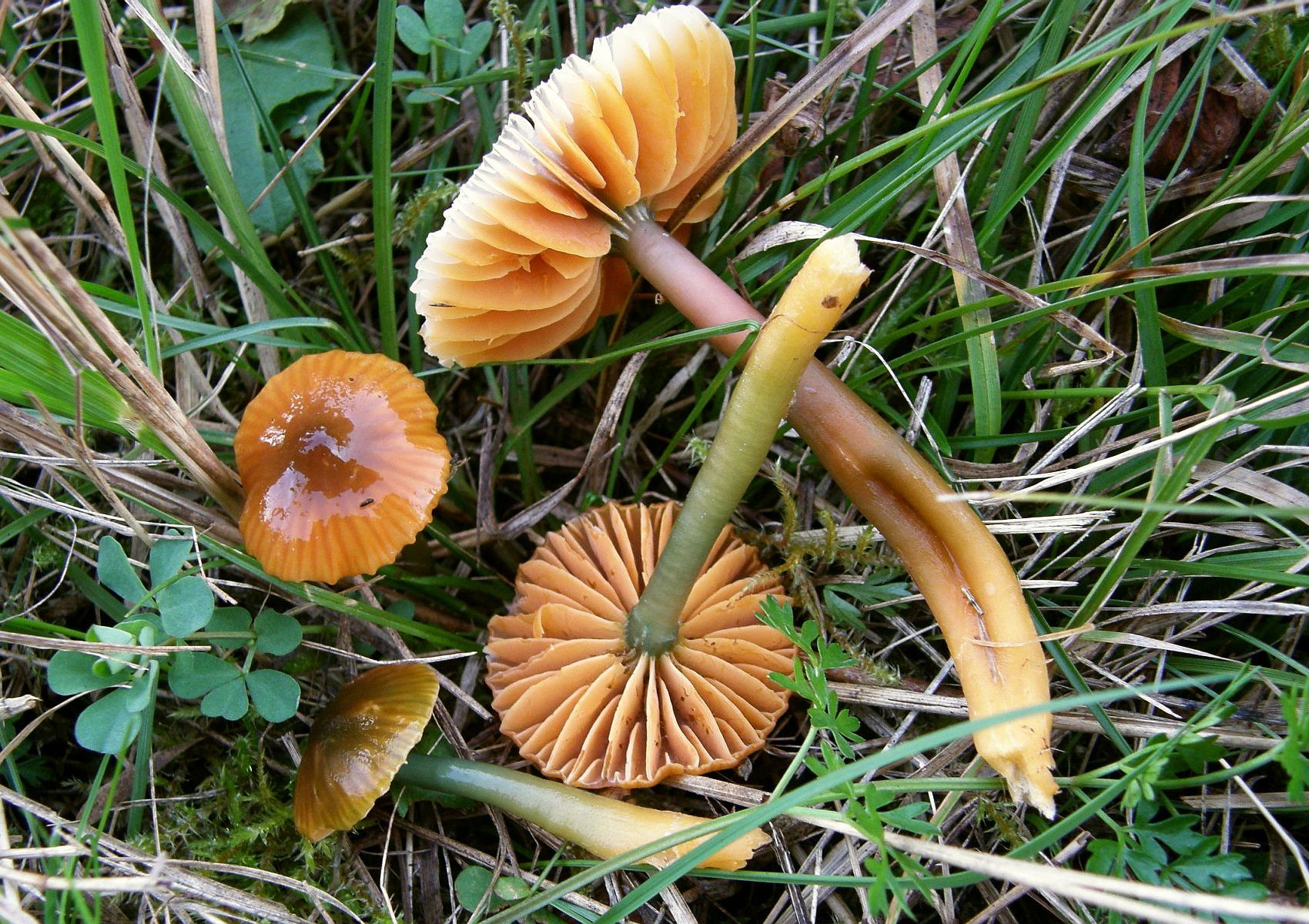 Der Fruchtkörper ist halt - wie Wolfgang schon schrub - ziemlich stark verwittert. Zudem ist Gliophorus psittacinus farblich äußerst variabel. Solche orangenen Hutfarben können auch bei frischeren fruchtkörpern auftreten, verstärken sich aber auch beim verwittern.
