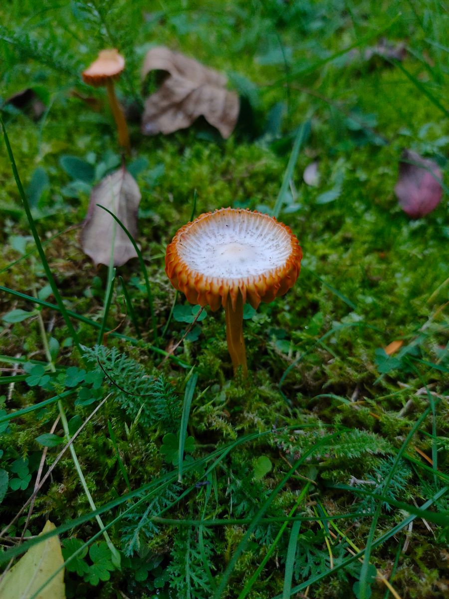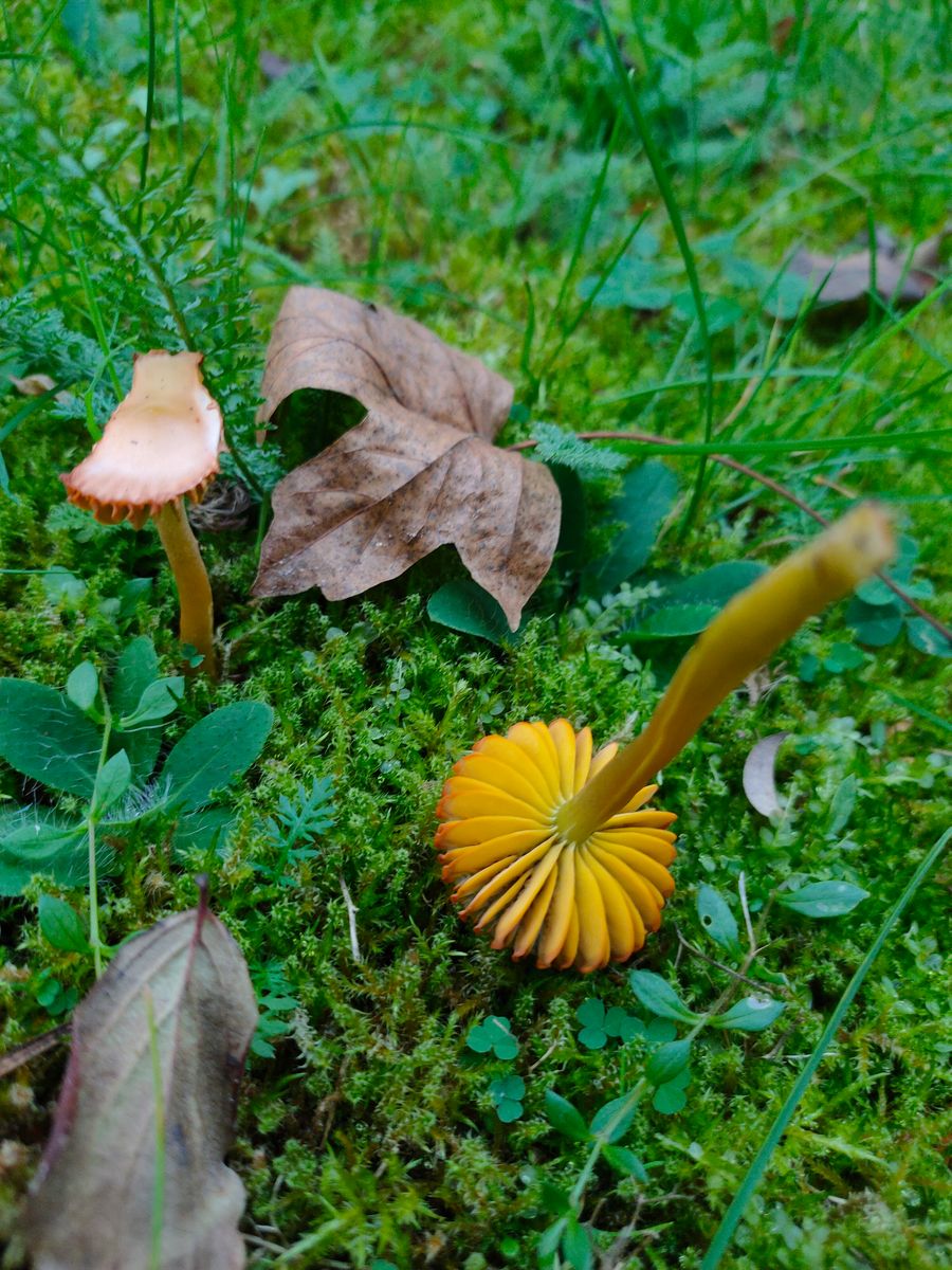Der Fruchtkörper ist halt - wie Wolfgang schon schrub - ziemlich stark verwittert. Zudem ist Gliophorus psittacinus farblich äußerst variabel. Solche orangenen Hutfarben können auch bei frischeren fruchtkörpern auftreten, verstärken sich aber auch beim verwittern.