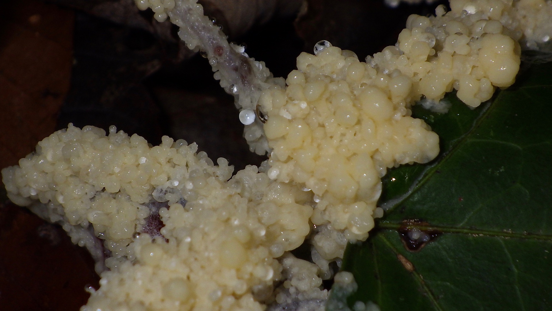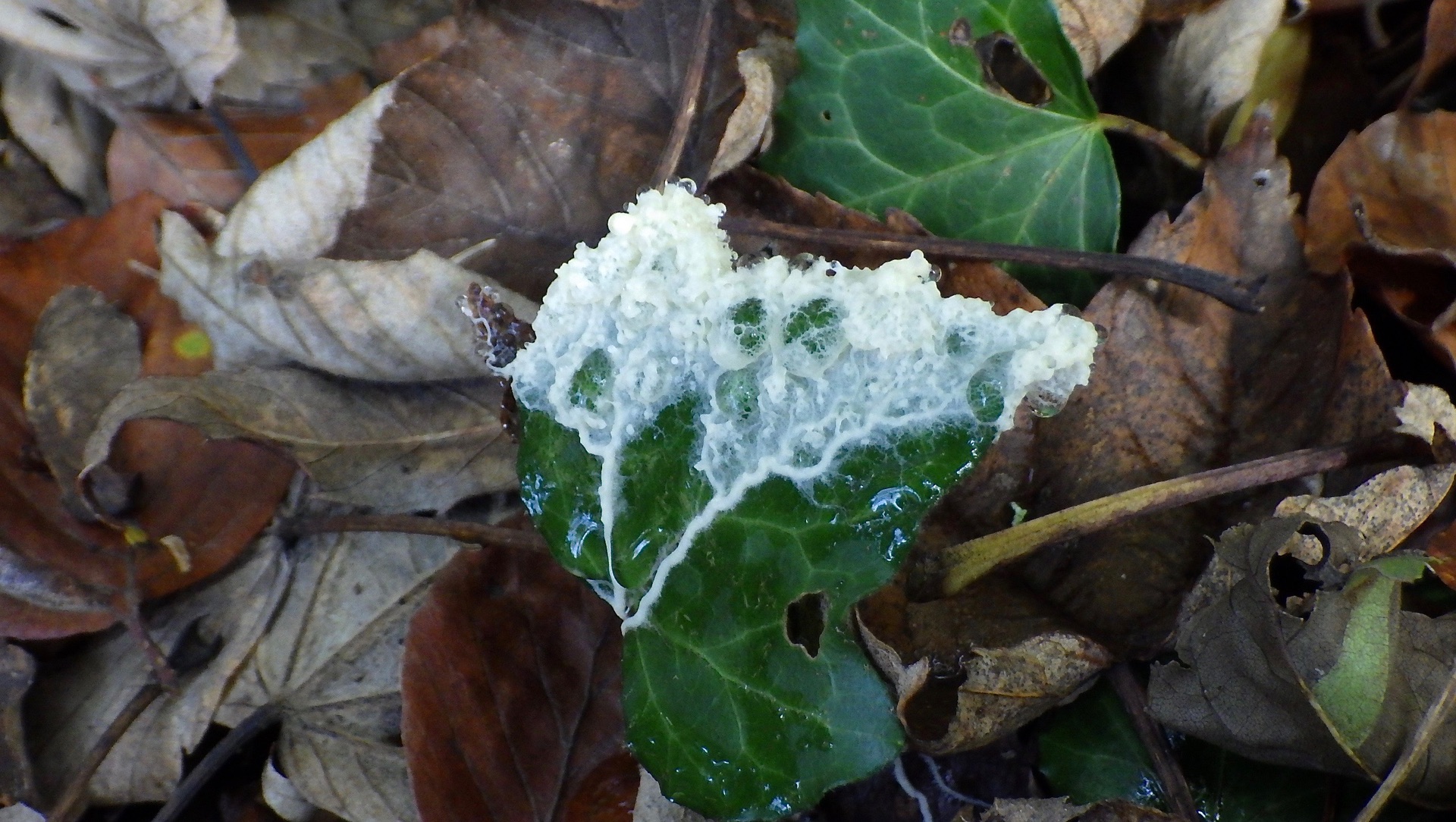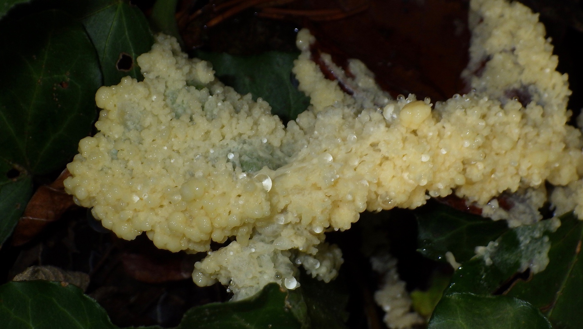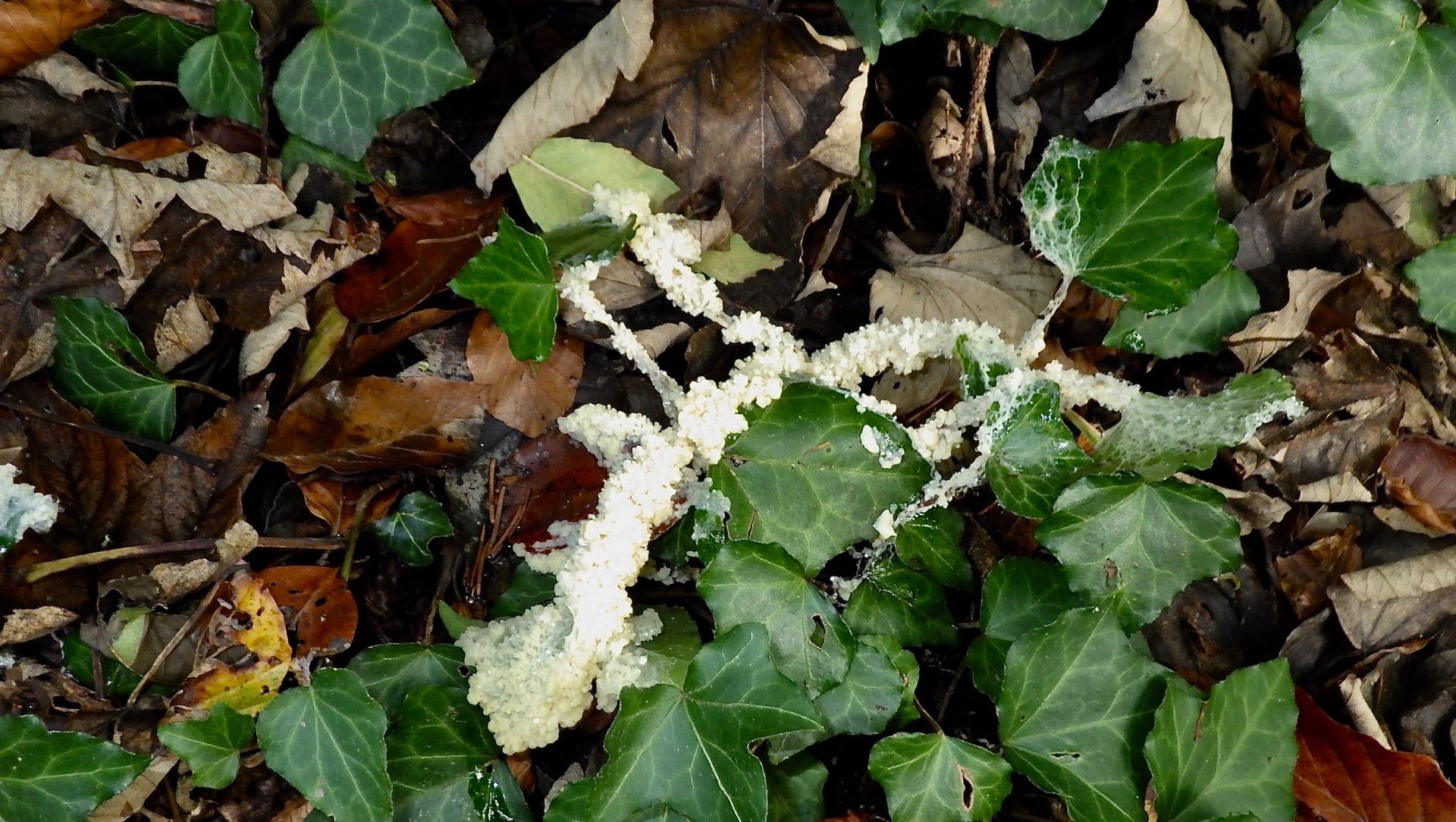 1.Weisse oder gelbe Lohblüte, in der Nahaufnahme wurde sie eher gelblich, die Schleimpilze waren weich, kaum zu fassen. An einem Blatt sah der Schleimpilz etwas anders aus.