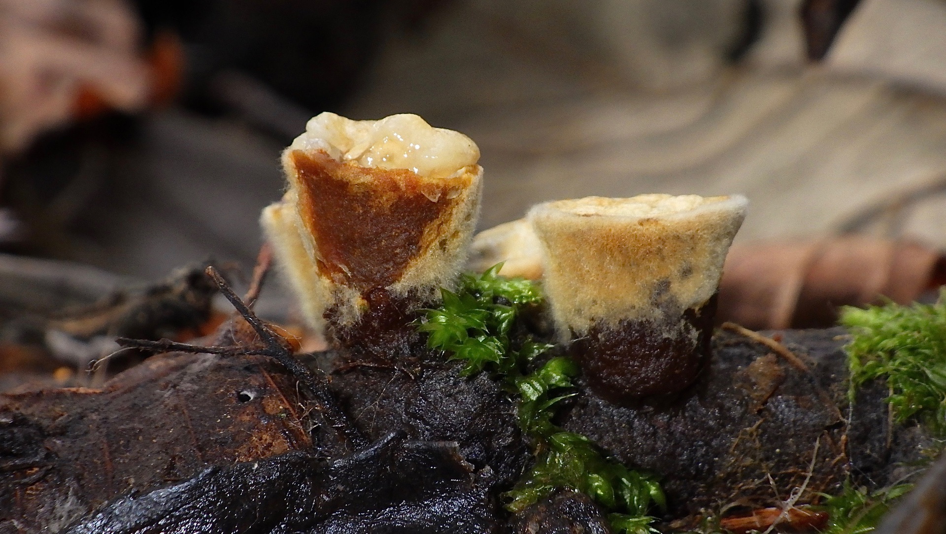 3. Junge Spalt-Blättlinge? Die von oben fast kreisrunden Pilzchen auf Totholz waren nur knapp 10mm breit, bei einem Pilz scheint etwas heraus zu wachsen! Die Hüllen waren haarig.