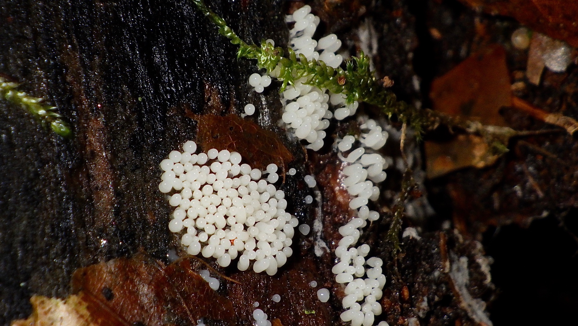 9. Ein weiterer Schleimpilz, aber welcher? Oder ganz was Anderes? Weiss auf Totholz, feucht und weich