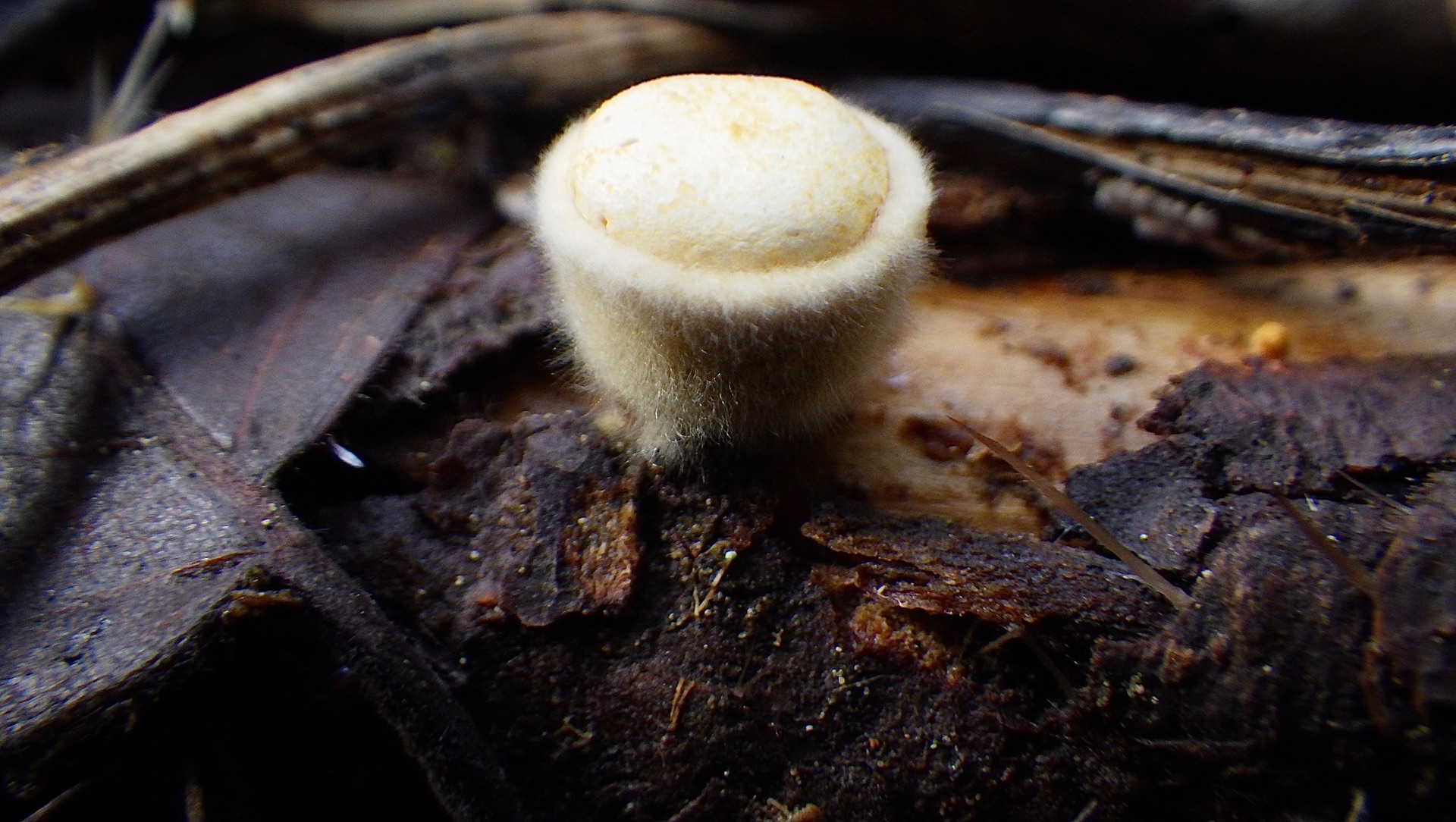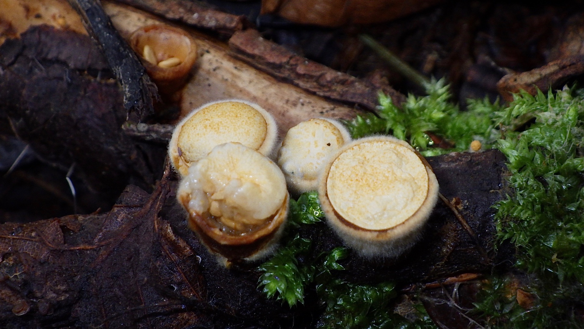 3. Junge Spalt-Blättlinge? Die von oben fast kreisrunden Pilzchen auf Totholz waren nur knapp 10mm breit, bei einem Pilz scheint etwas heraus zu wachsen! Die Hüllen waren haarig.