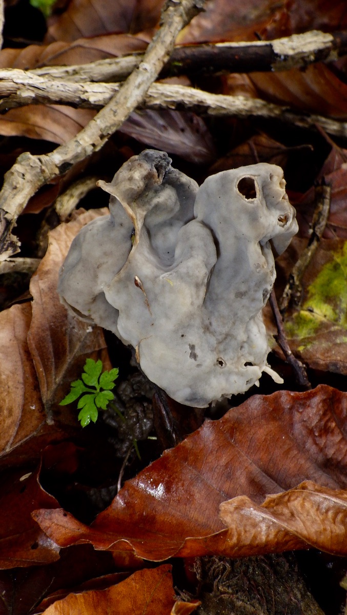 2) Gleiches Blatt heute mit farblosem Mucilago crustacea -Schaumpilz