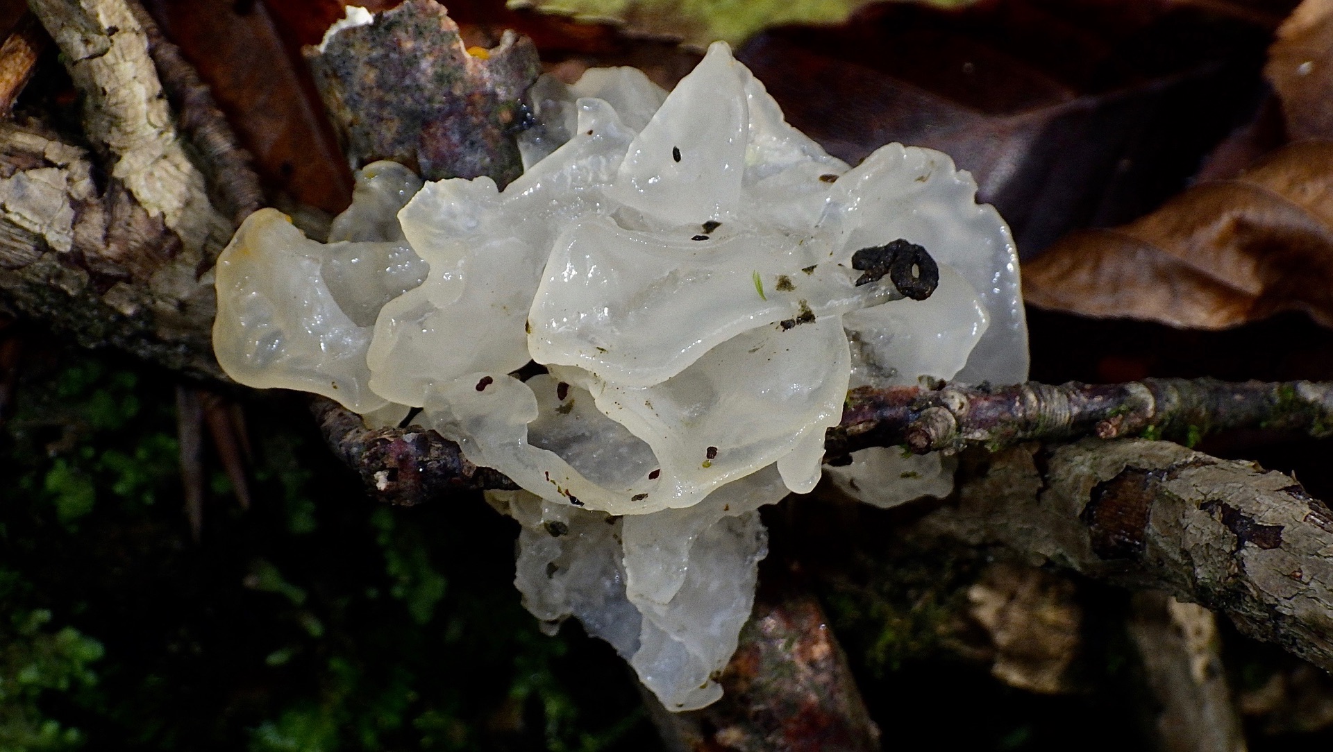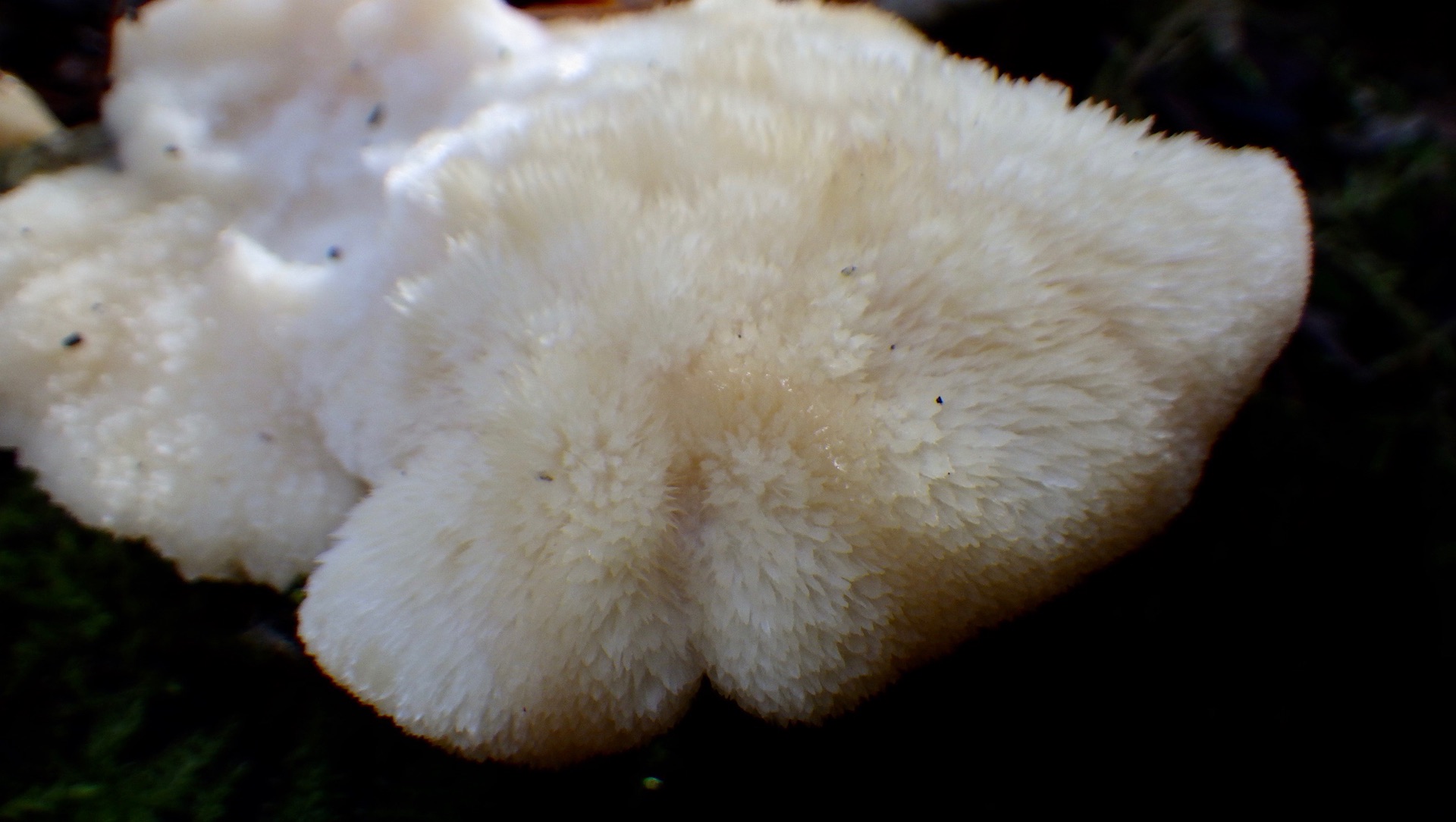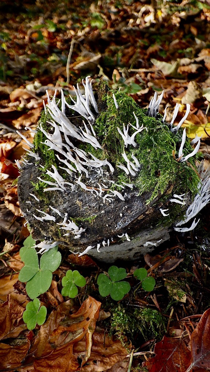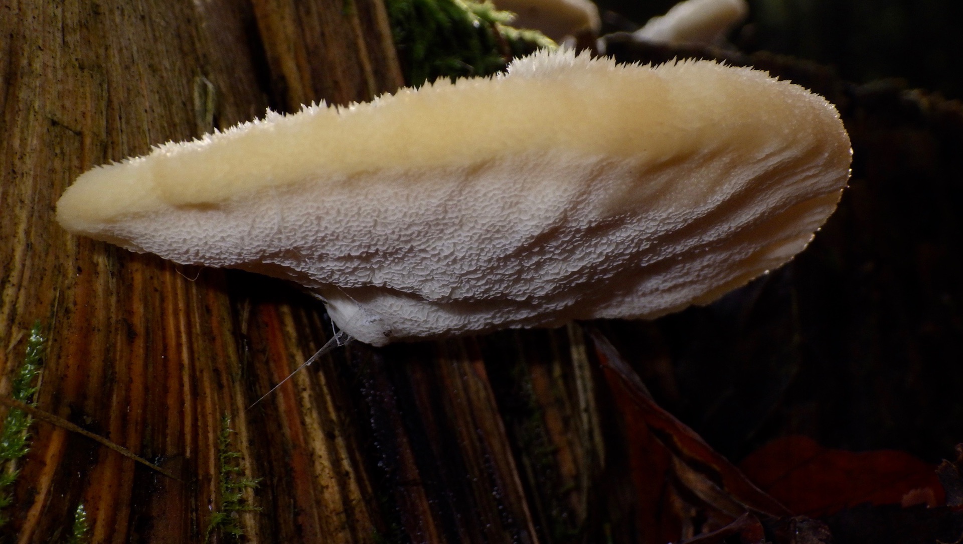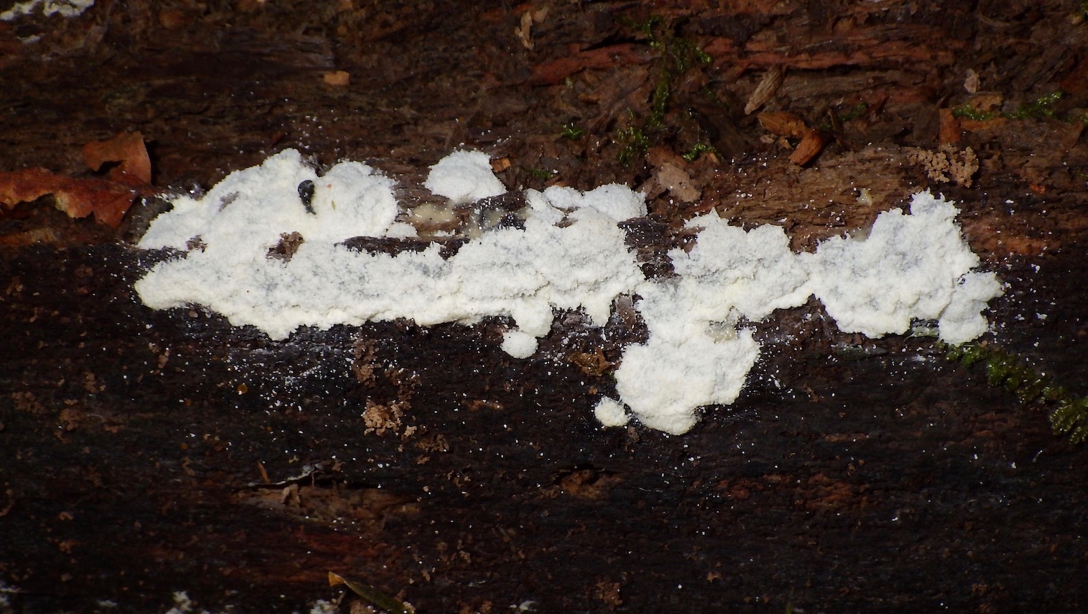 9. Ein weiterer Schleimpilz, aber welcher? Oder ganz was Anderes? Weiss auf Totholz, feucht und weich