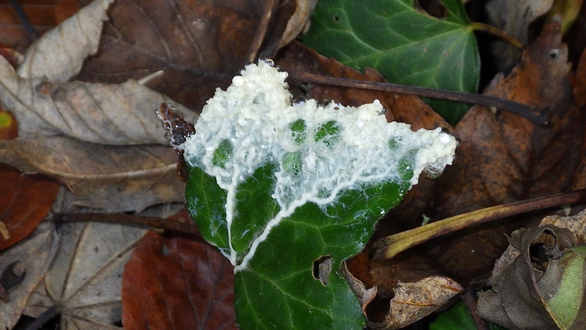 1.Weisse oder gelbe Lohblüte, in der Nahaufnahme wurde sie eher gelblich, die Schleimpilze waren weich, kaum zu fassen. An einem Blatt sah der Schleimpilz etwas anders aus.
