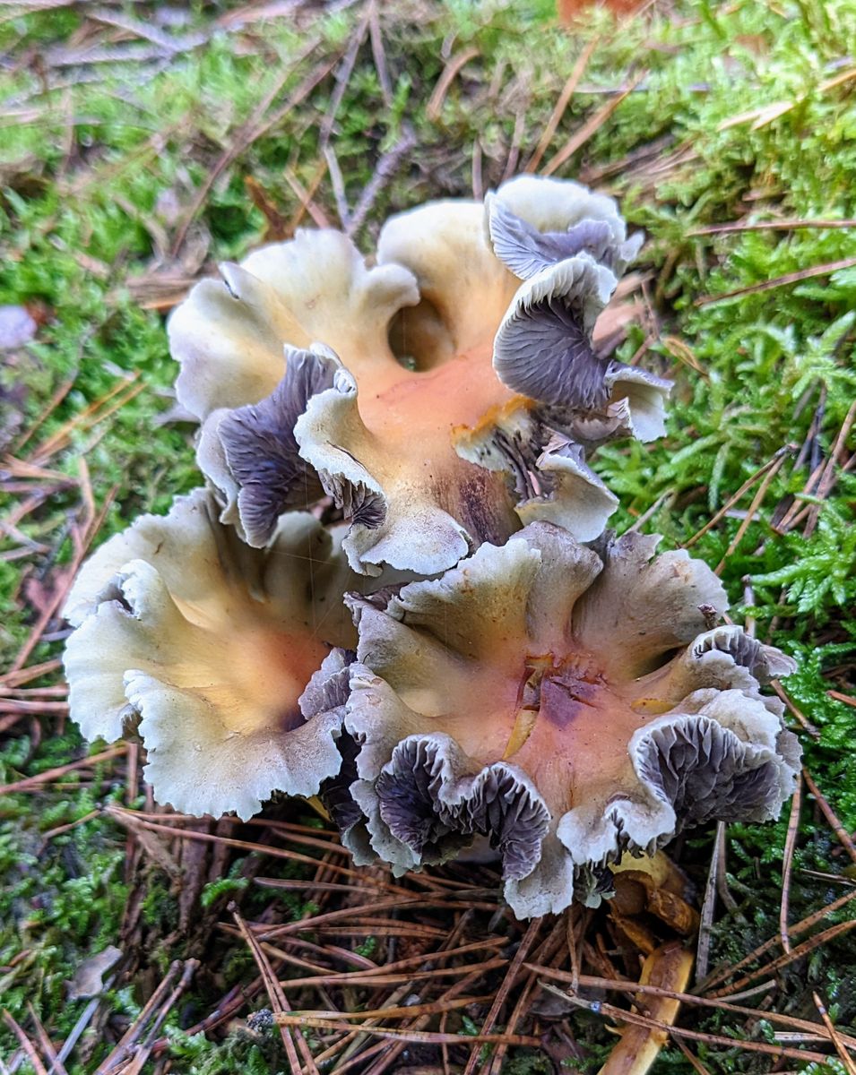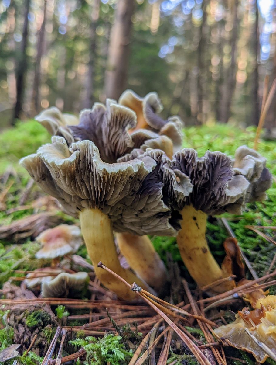 Diese wunderschönen Pilze fand ich im Kiefernmischwald. Da ich eigentlich nach Reizkern schaute, habe ich nur ein schnelles Foto gemacht ohne ernsthafte Bestimmungsabsichten. Bei der Bildersuche bekam ich aber jetzt Fotos von Trompetenpfifferlingen angezeigt, die meinen Pilzen sehr ähnlich sehen. Ich hätte allerdings meine Pilze als Lamellenpilze eingestuft, leider habe ich kein Foto direkt von unten. Und die Trompetenpfifferlingen, die ich kenne und schon reichlich gesammelt habe, sahen auch irgendwie anders aus, liegt aber vielleicht am Alter?