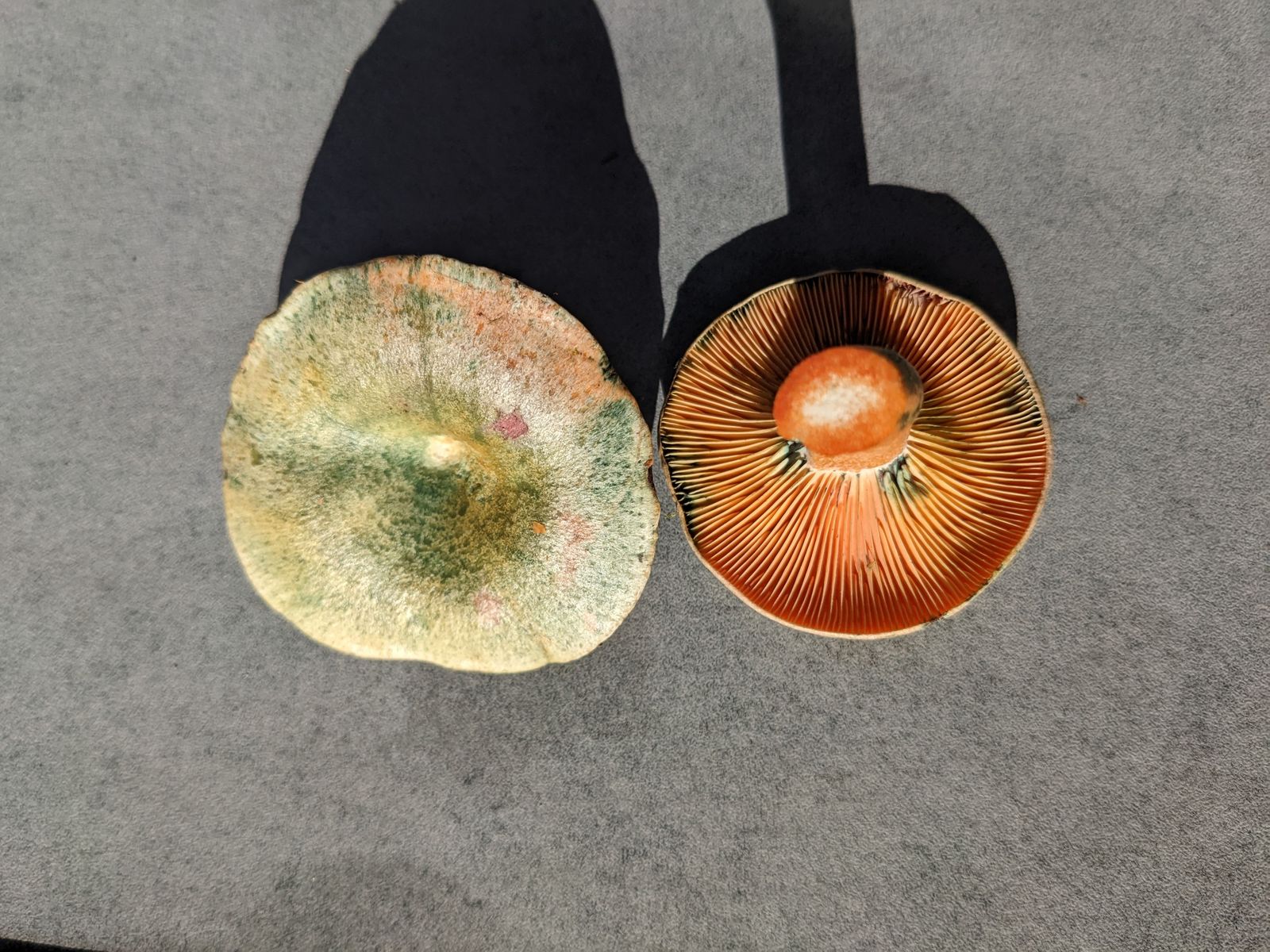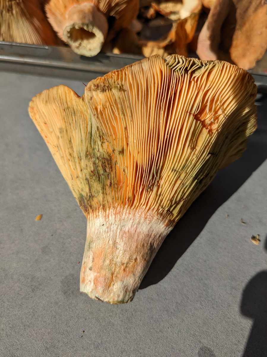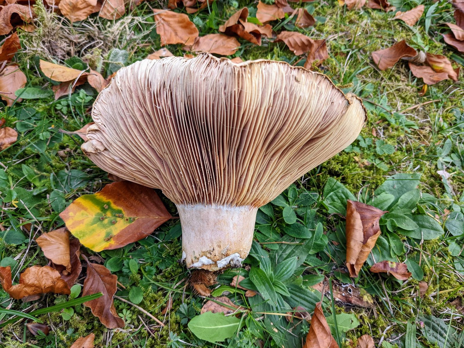 ... oder doch ein Fichtenreizker? Auf den Spangrünen komme ich, weil ich in der Nähe nur Kiefern gesehen habe. Der Fundort ist auch ein anderer als bei Reizker 2. Außerdem ist der Hut trotz des jungen Alters extrem grün. Die Milch verfärbt sich ebenfalls innerhalb von Minuten von orange zu dunkelrot/weinrot. Was nicht passt, ist der Stiel, richtig? Der hat keine Grübchen und ist genauso orange wie beim Fichtenreizker. Also war die Fichte vielleicht etwas weiter weg oder hat sich zwischen Laubbäumen versteckt...?