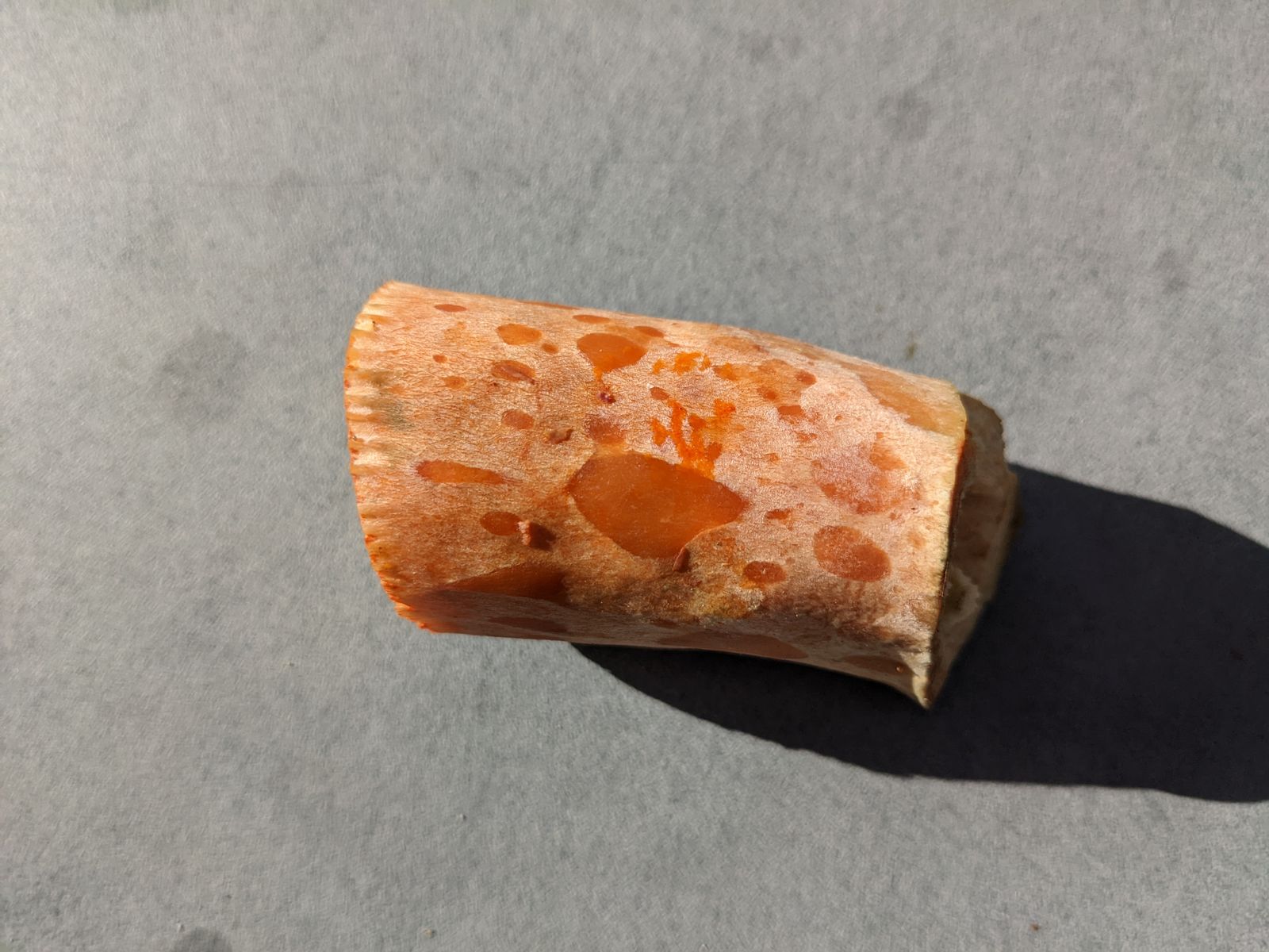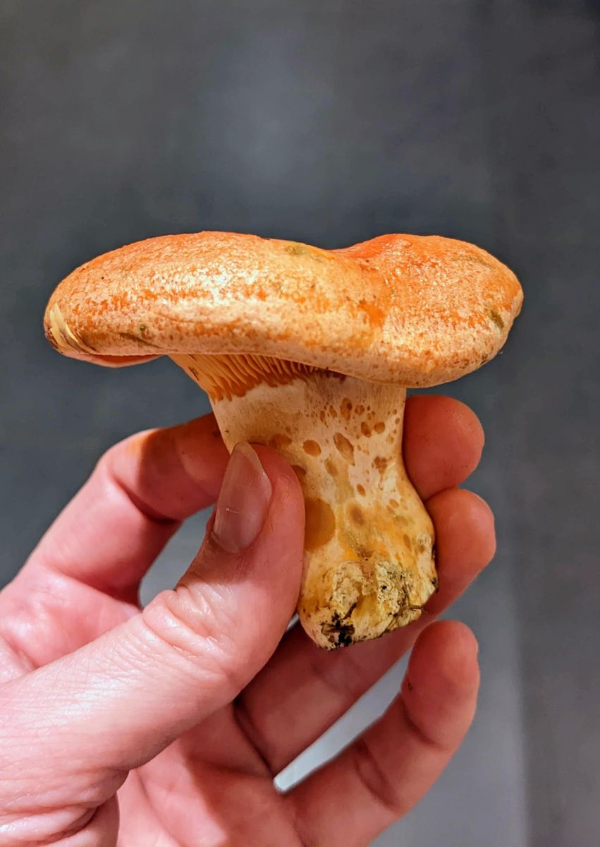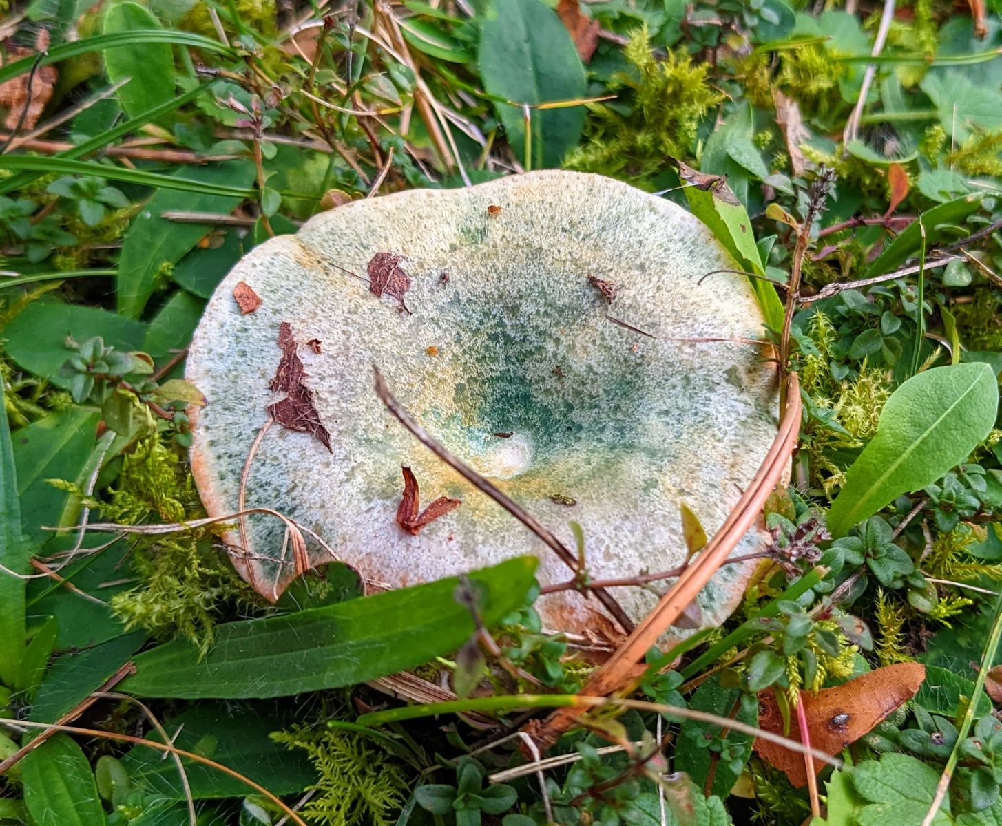 ... oder doch ein Fichtenreizker? Auf den Spangrünen komme ich, weil ich in der Nähe nur Kiefern gesehen habe. Der Fundort ist auch ein anderer als bei Reizker 2. Außerdem ist der Hut trotz des jungen Alters extrem grün. Die Milch verfärbt sich ebenfalls innerhalb von Minuten von orange zu dunkelrot/weinrot. Was nicht passt, ist der Stiel, richtig? Der hat keine Grübchen und ist genauso orange wie beim Fichtenreizker. Also war die Fichte vielleicht etwas weiter weg oder hat sich zwischen Laubbäumen versteckt...?