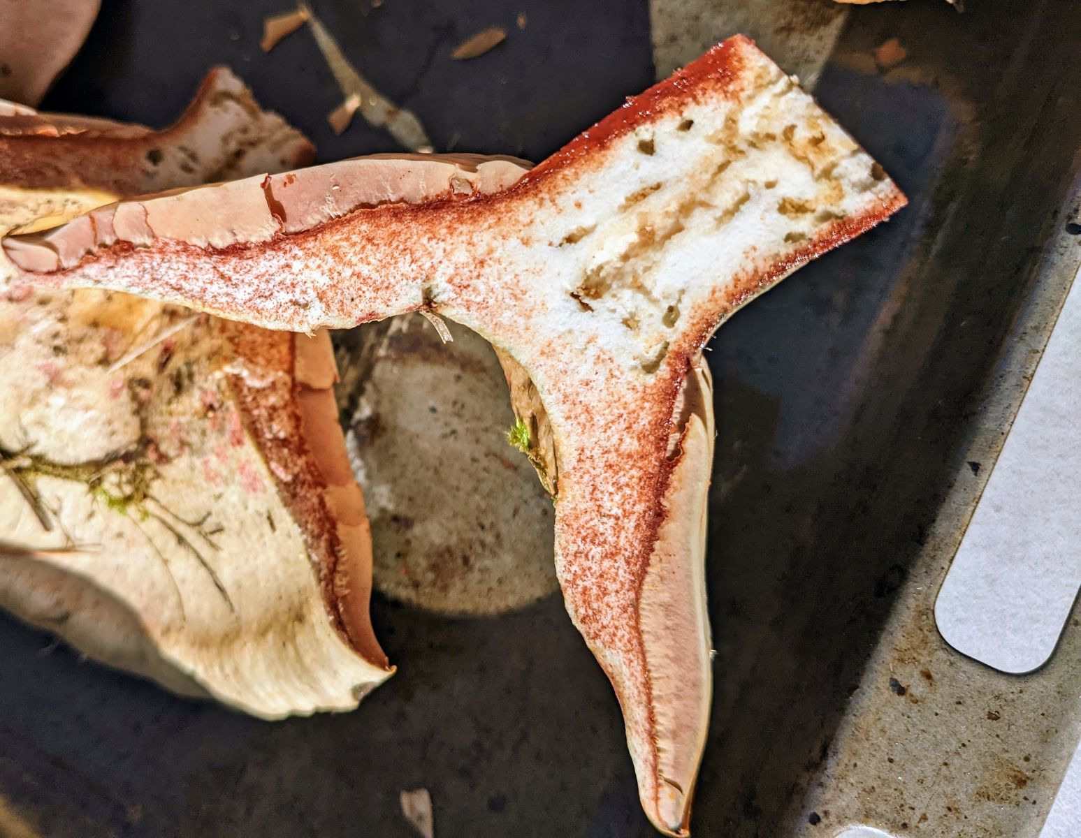 Reizker 4: Auf derselben Wiese bei Kiefern wie Reizker 3. Ich dachte zunächst an ältere Fruchtkörper, aber diese hier haben einen sehr hellen Hut mit weinroten Flecken, hellere Lamellen und vor allem ist die Milch sofort weinrot und nie orange. Meine Vermutung ist daher ein Weinroter Kiefernreizker?