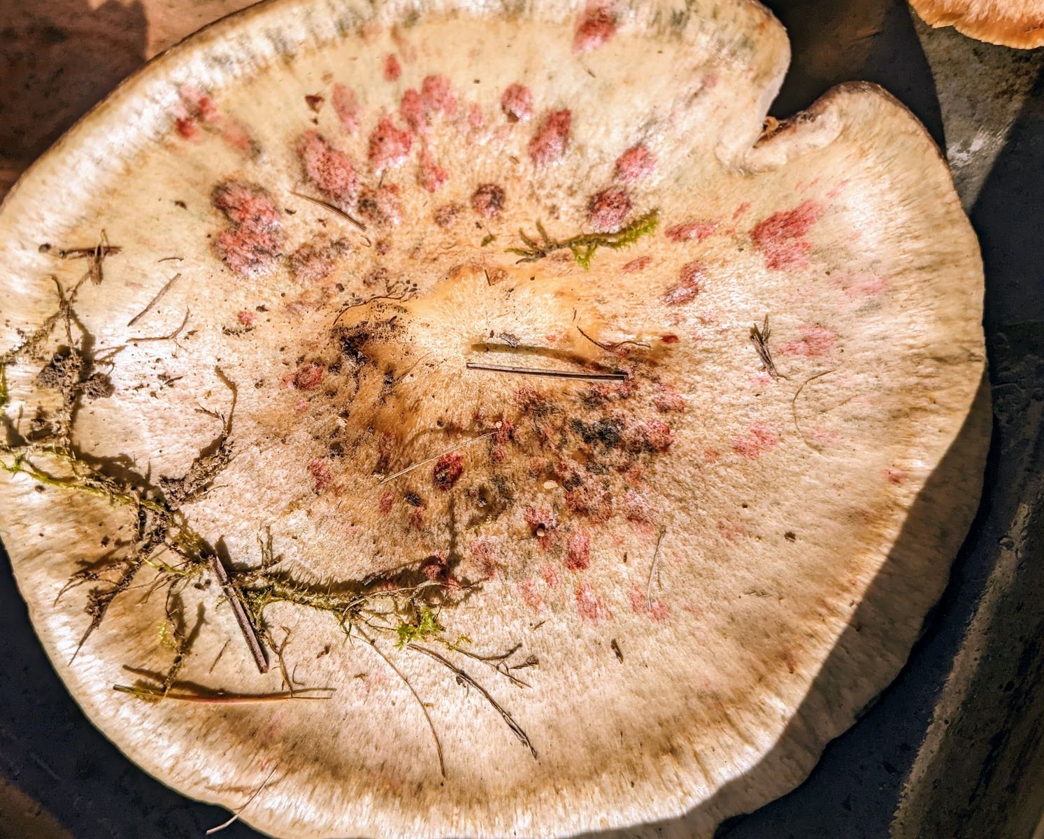 Reizker 4: Auf derselben Wiese bei Kiefern wie Reizker 3. Ich dachte zunächst an ältere Fruchtkörper, aber diese hier haben einen sehr hellen Hut mit weinroten Flecken, hellere Lamellen und vor allem ist die Milch sofort weinrot und nie orange. Meine Vermutung ist daher ein Weinroter Kiefernreizker?