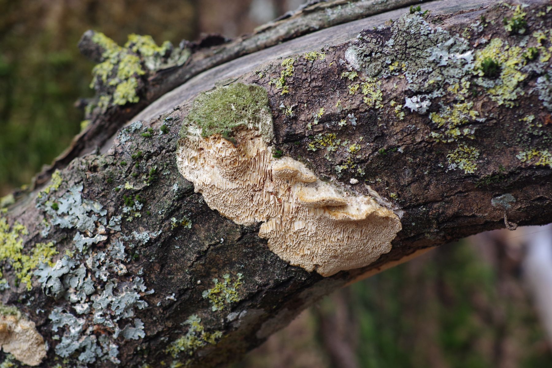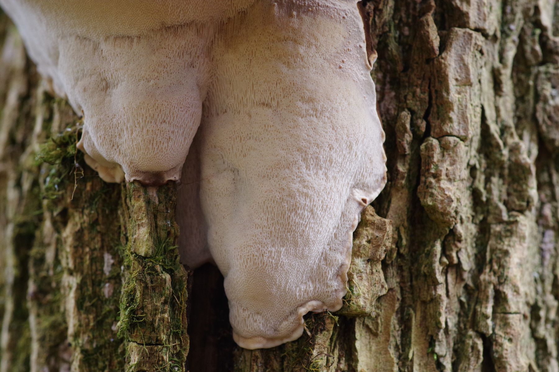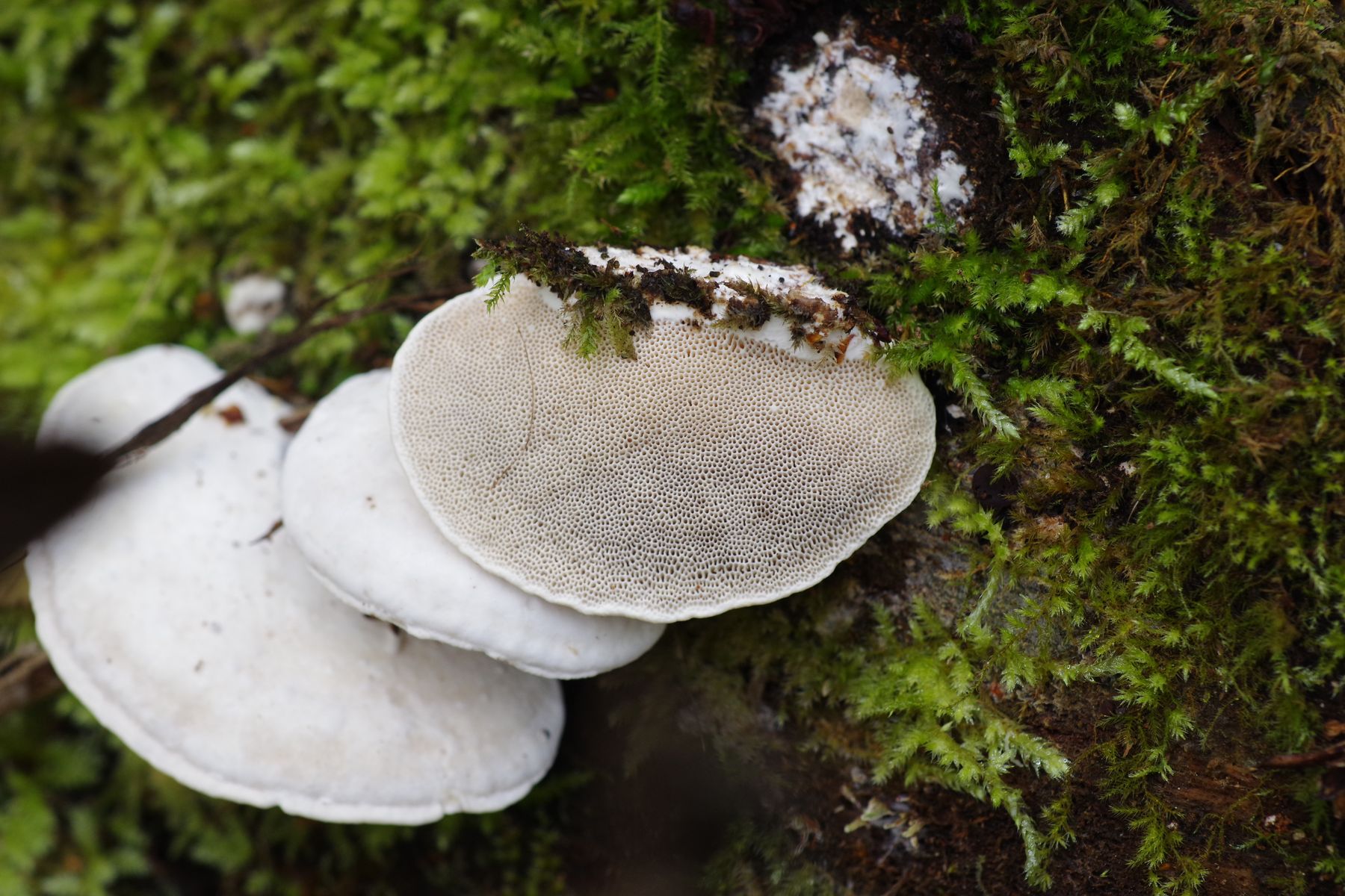 2) Trametes suaveolens, an Resten von Salix fragilis, stark riechend, das obere Exemplar 6 cm breit, Poren 1-2 pro mm, nicht saftig, hart bis korkig im Schnitt