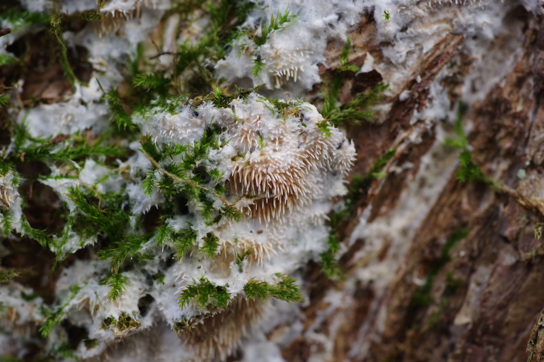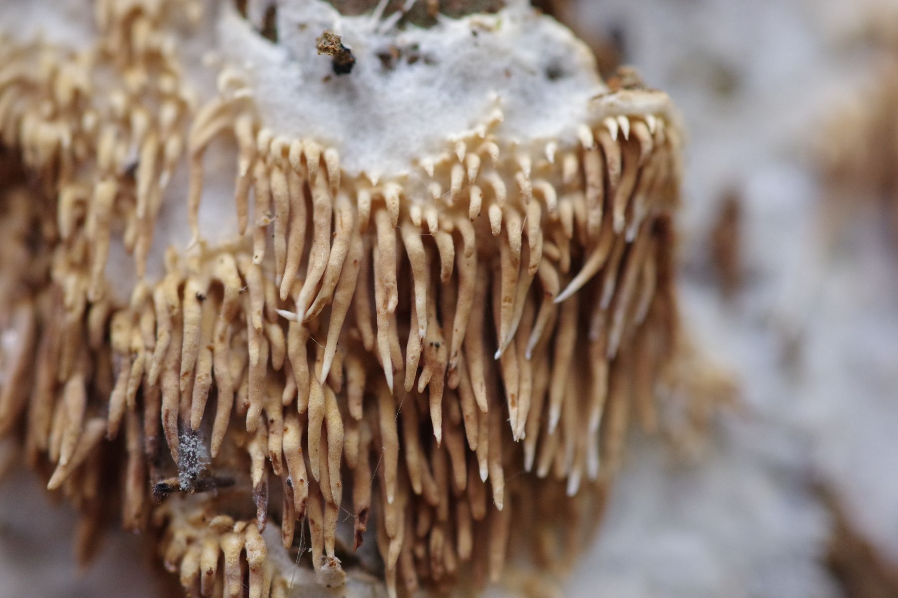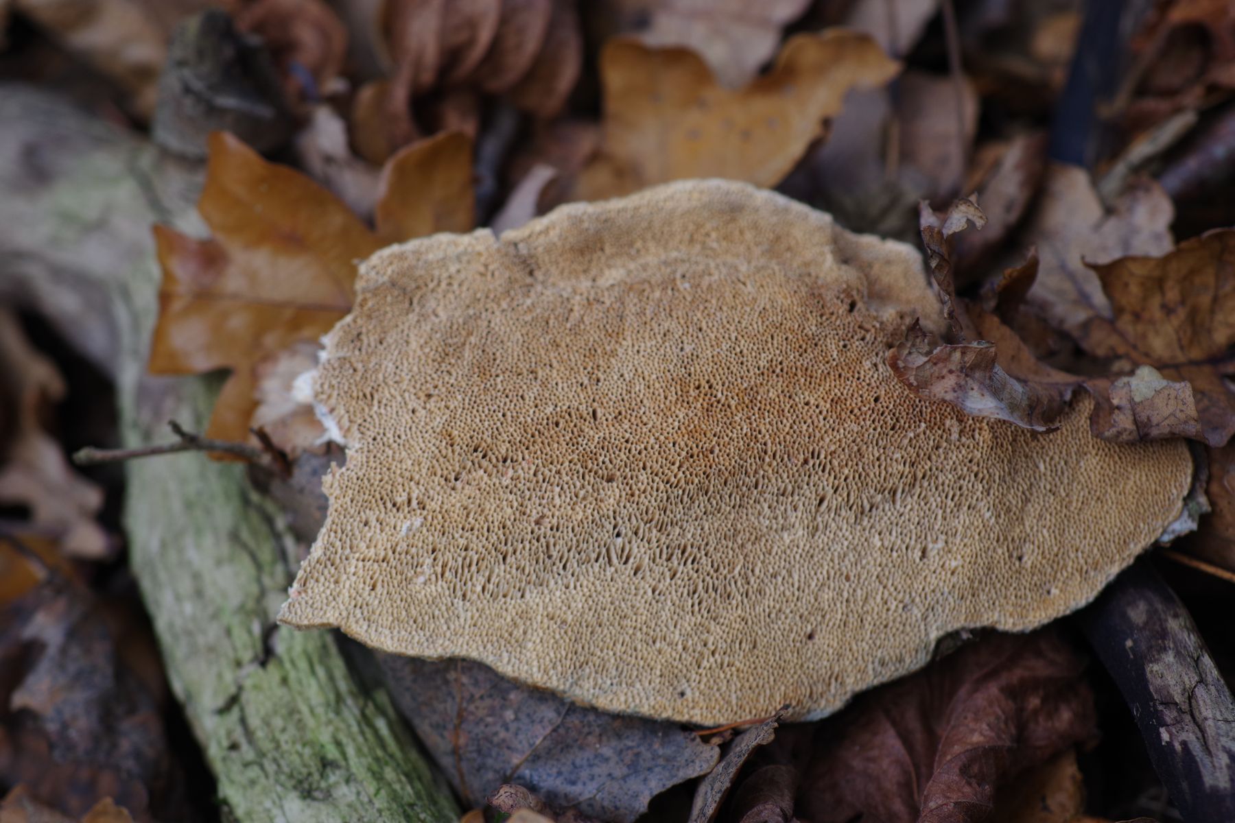 2) Trametes suaveolens, an Resten von Salix fragilis, stark riechend, das obere Exemplar 6 cm breit, Poren 1-2 pro mm, nicht saftig, hart bis korkig im Schnitt