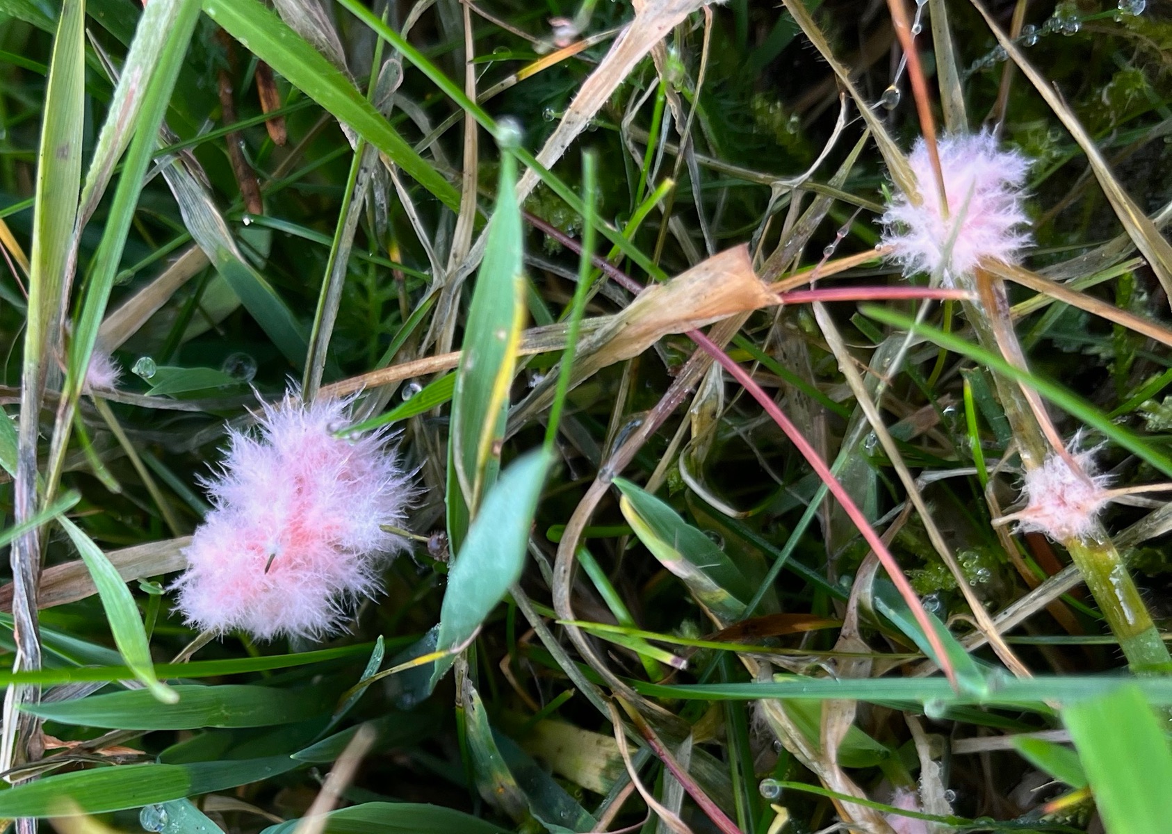 Ich kann mich erinnern, dass so ein rosa Puschel im Gras schon einmal hier im Forum gezeigt wurde. Aber ich finde den Beitrag nicht. Vielleicht kann eine/r von euch helfen.