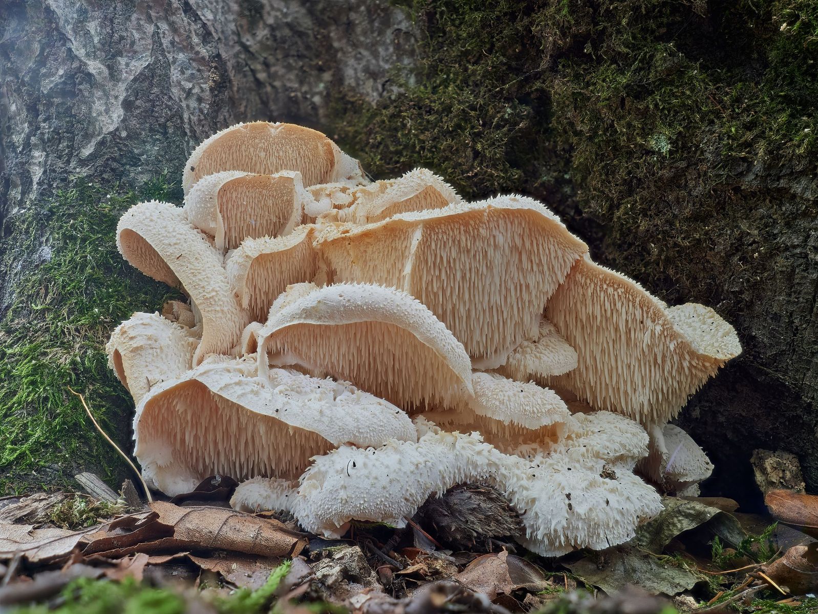 Steuerte heute einige der Pilzstellen unseres Dorfwaldes an, um nach Fotomotiven zu suchen. In einem ca. 80jährigen Rotbuchenbestand war außer buntem Falllaub zunächst nichts zu finden. Plötzlich entdeckte ich in einigen Metern Distanz einen weißen Farbtupfer an der Basis eines vermorschten Buchenstubbens. Wollte diesem zuerst keine weitere Aufmerksamkeit schenken, da ich von einem Porling ausging. Zum Glück erkannte ich noch rechtzeitig die "Bedornung" auf den Hutoberseiten.pilzforum.eu/attachment/454392/