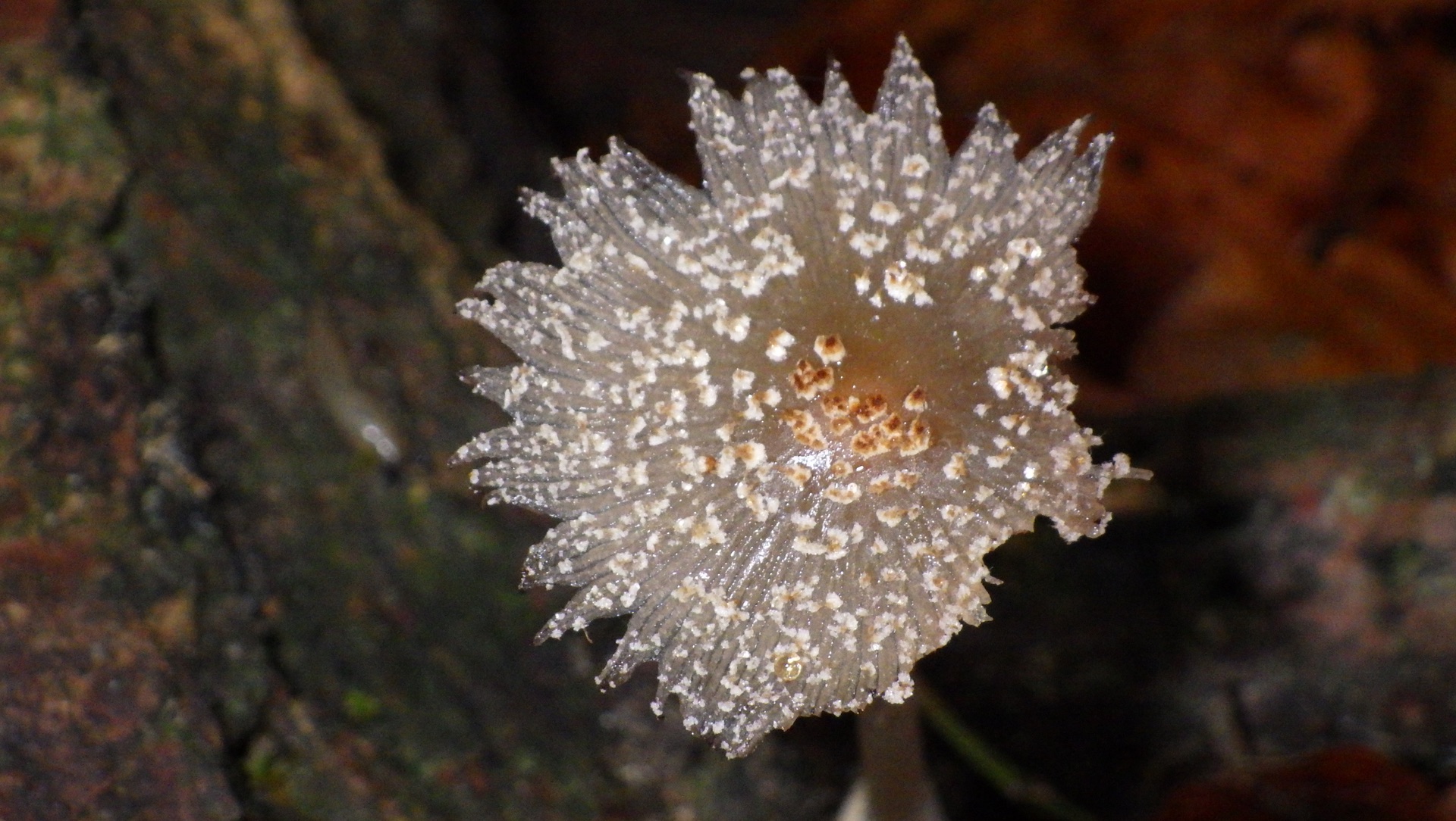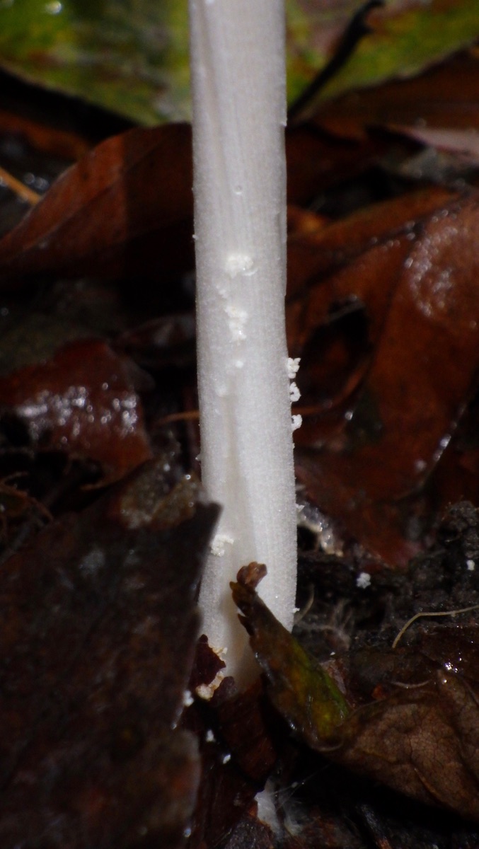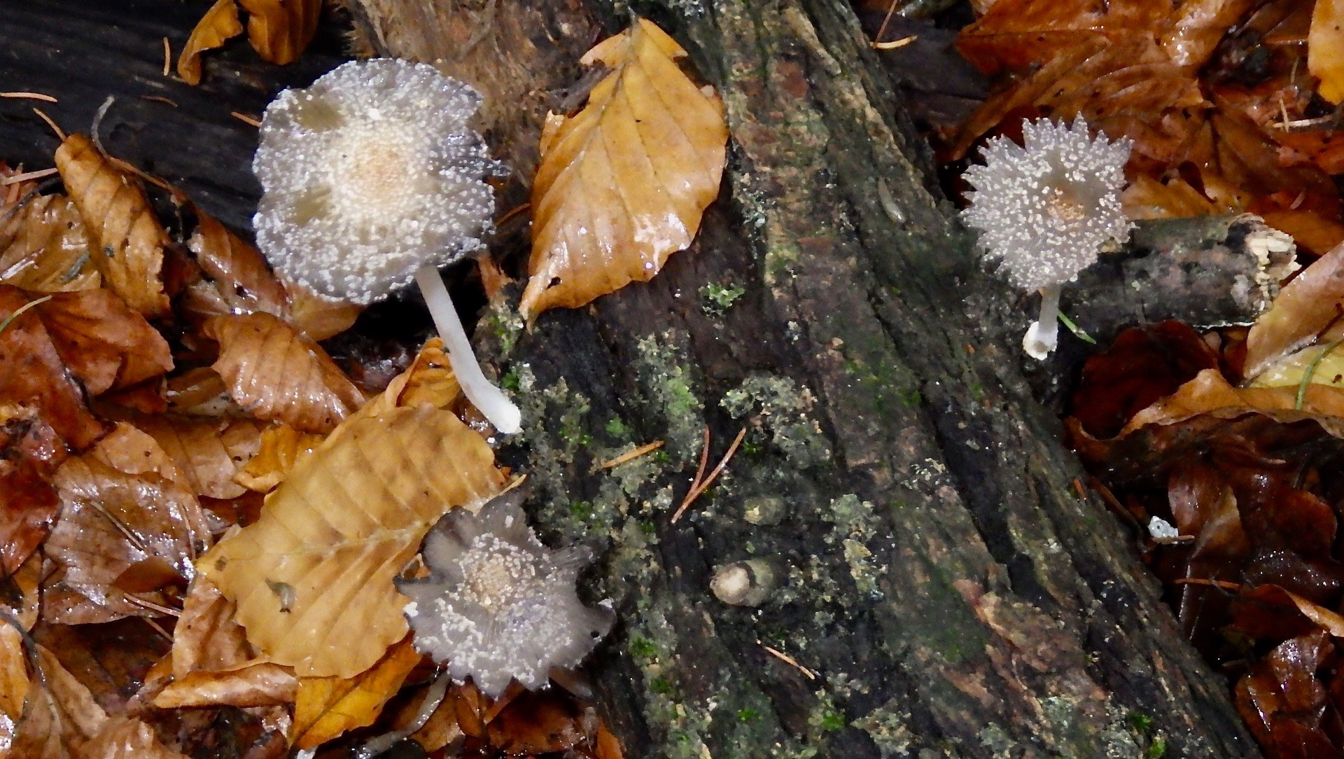 1) An einem Totholz weisser Stiel ohne Flocken, die dunklen Hüte aber voll Velumreste, einiges könnte für Hasenpfoten sprechen, aber die glatten Stiele und der Standort passen nicht gut.