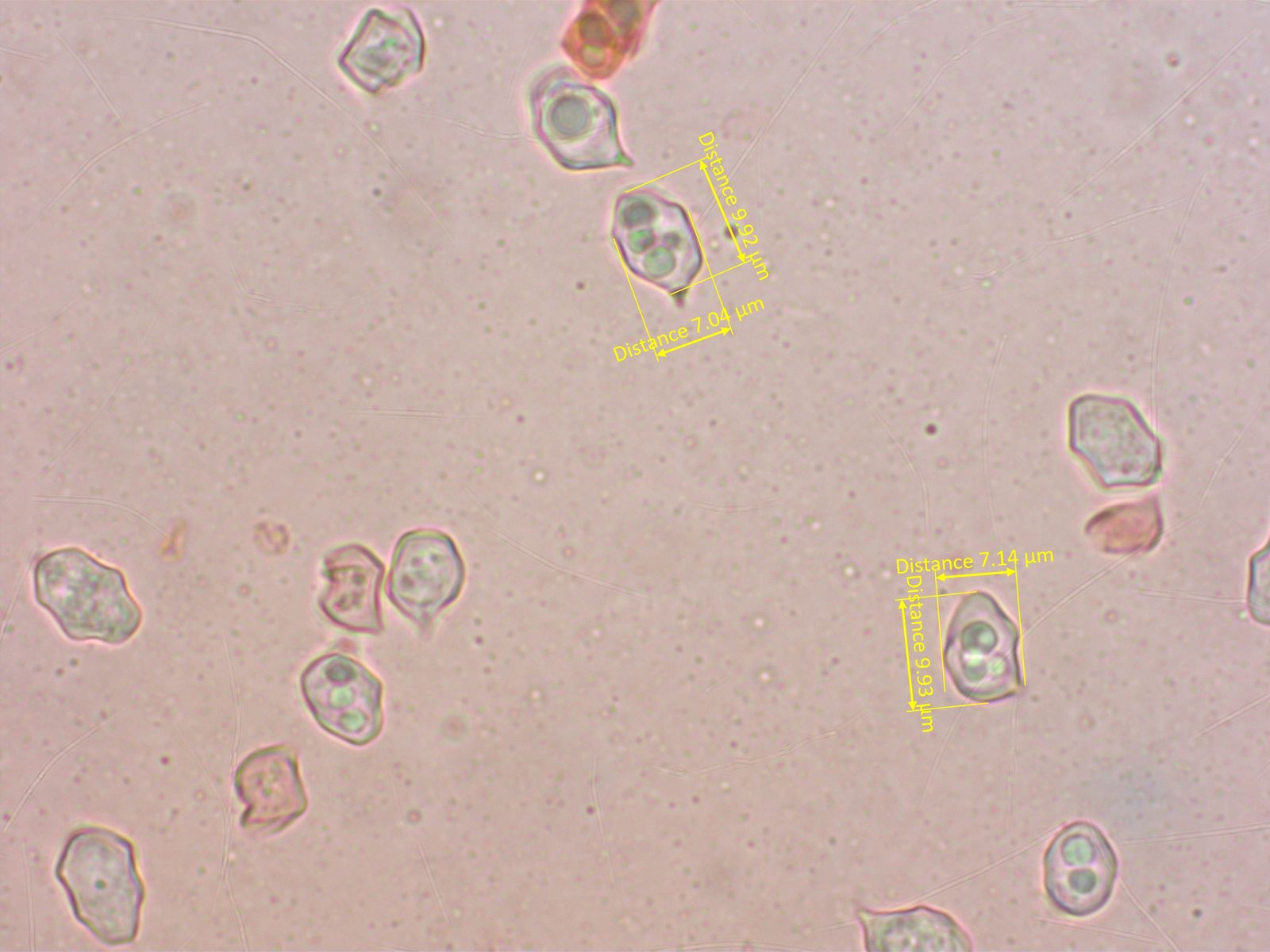 Die Sporen sind recht unregelmässig geformt, im Schnitt 9-10 x 6.5-7.5 µm.