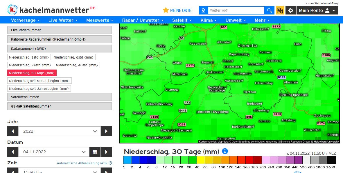Kalibr. Niederschlagsumme, letzte 30 Tage) vom 04.11.2022, 06:50 Uhrkachelmannwetter.comDas Zoomen mit den Icons bzw. auch Klicken ist manchmal sehr hakelig. Am besten funktioniert es, wenn du im linken Bereich auf "Kartenausschnitt wechseln" klickst und dann direkt dein Bundesland oder deinen Landkreis auswählst.