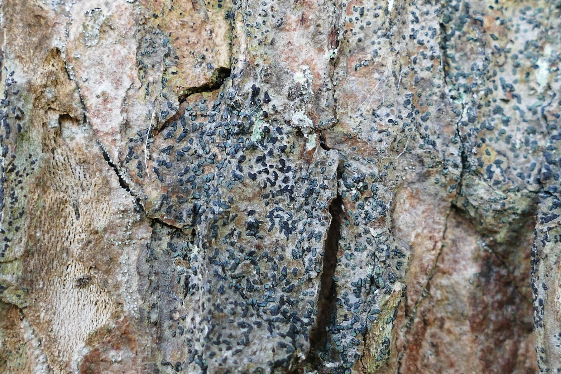 An einem der Laubbäume am Wegesrand neben dem Flüsschen fallen mit viele schwarze, fast lirellenförmige Apothecien auf.