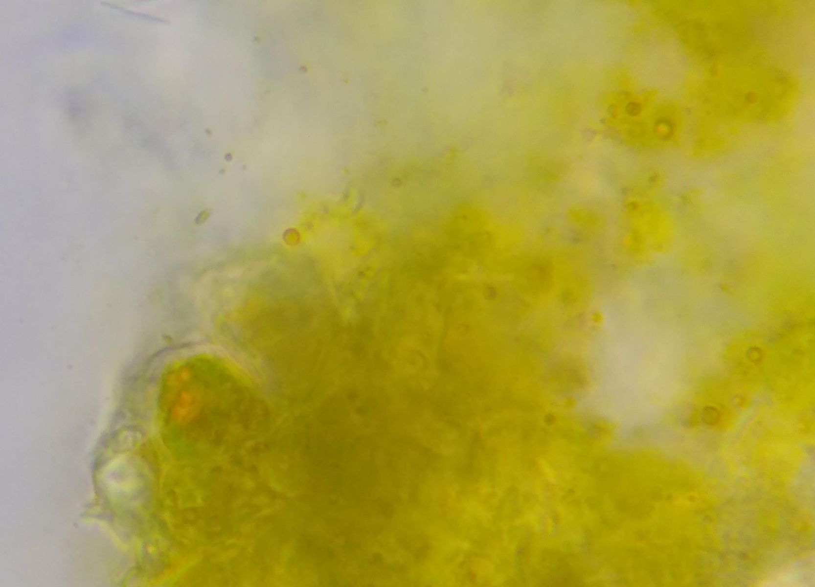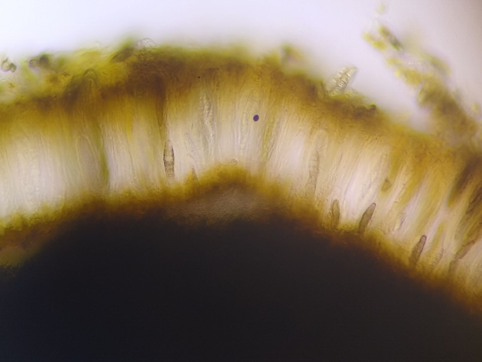 Bild 5 Hymenium nach Lugoleinwirkung (J+), gelbe Schläuche und blaue Gallerte mischen sich zu einem grünem Gesamteindruck.