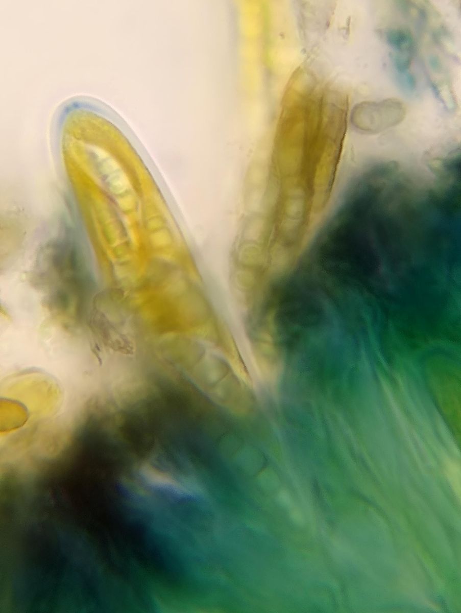 In Lugol reagiert die Hymenialgallerte K/J+ blau, das Ascoplasma tiefgelb, die Wand bereichsweise bläulich, ein winziger Apikalapparat scheint erkennbar.