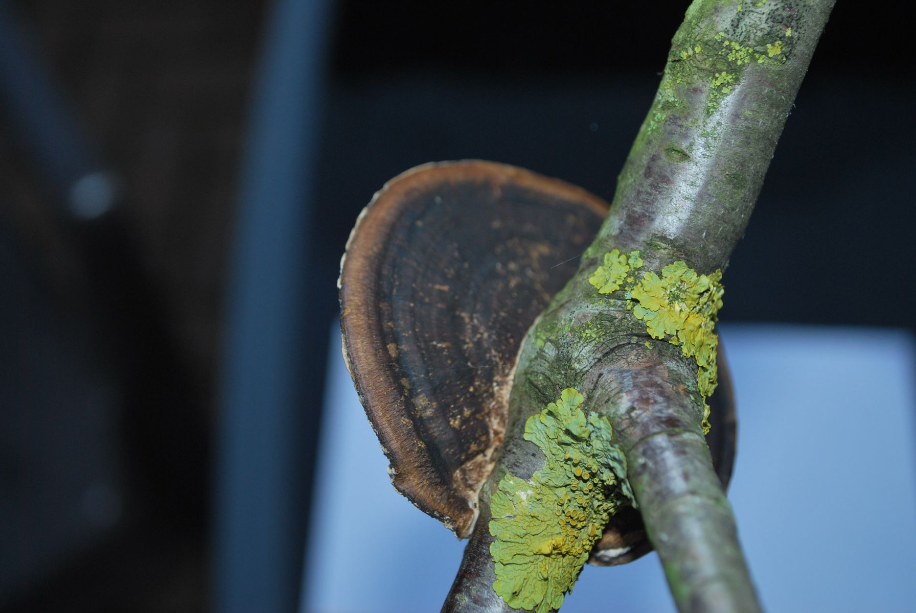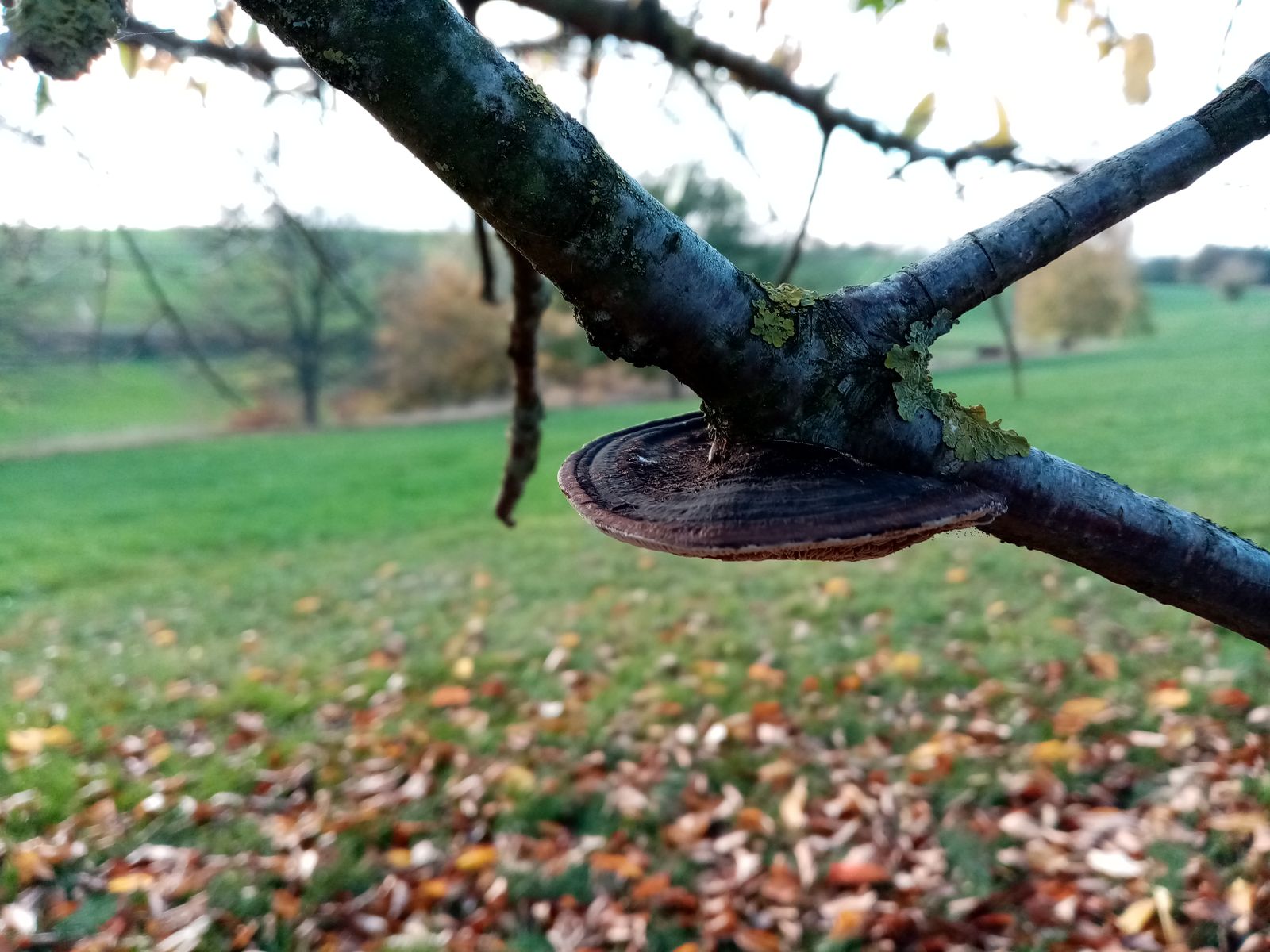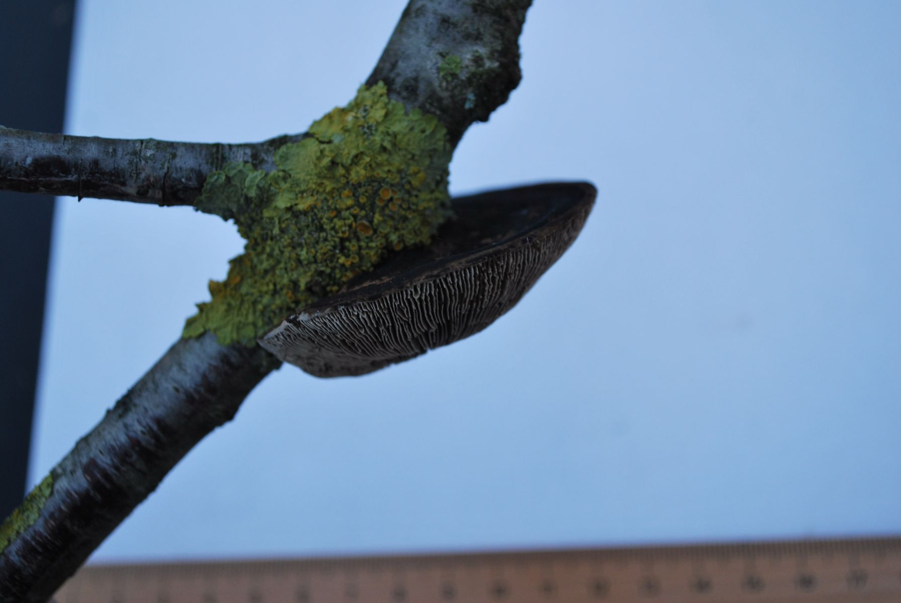 diesen FK fand ich heute an einem faktisch abgestorbenen Ast eines Vogelkirsche-Gehölzes (Prunus avium) auf einer Wiese neben Äckern (er brach noch ab) und ich halte ihn aufgrund der Merkmale für Gloeophyllum separium (Wulfen: Fr.) P. Karst. Ich dachte aber, diese Art kommt nur auf Nadelhölzern vor und dieses Gehölz war eindeutig eine Vogel-Kirsche, mithin ein Rosengewächs.