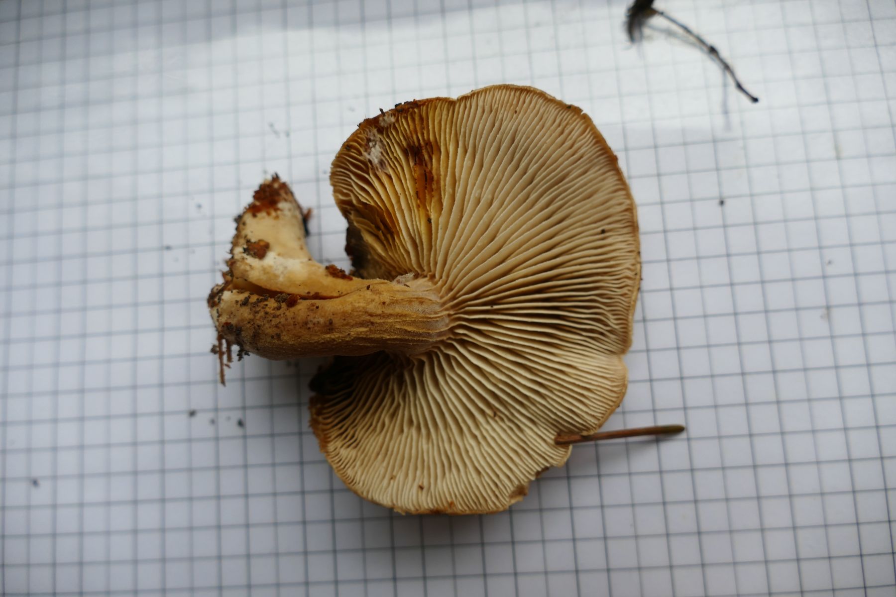 Der Stiel erweist sich bei genauerer Betrachtung im oberen Bereich zwischen den verlängerten Lamellen als sehr feinfilzig (Kaulozystiden)?.