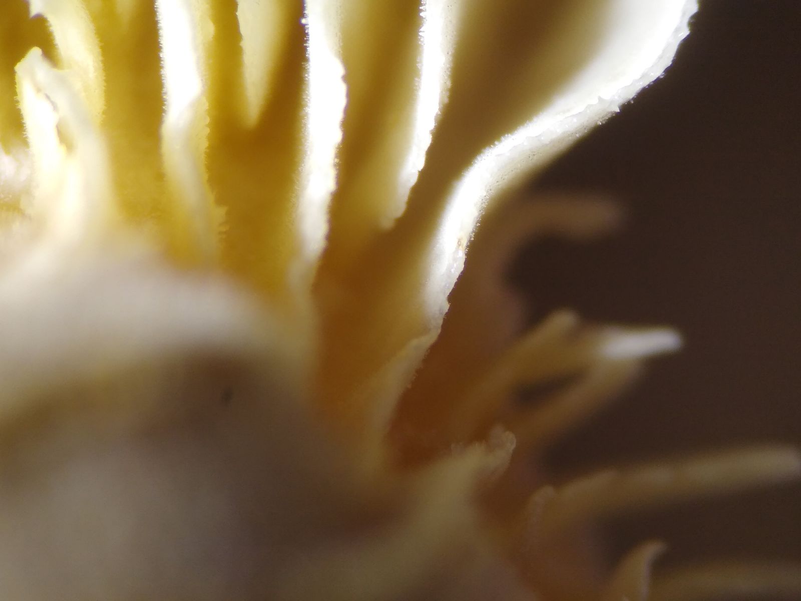 Zwischen den Lamellen erkennt man viele feine Strukturen, die ich erst für Pleurozystiden hielt, die sich aber mikroskopisch nur als Hyphenenden herausstellten.