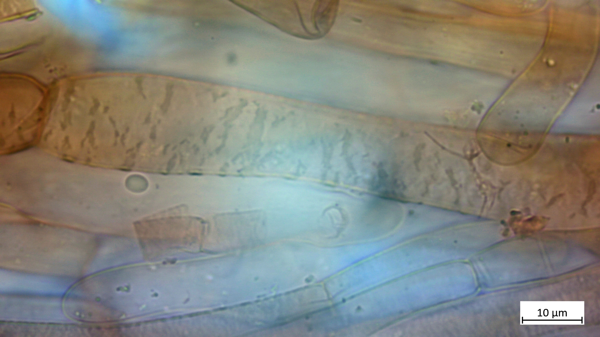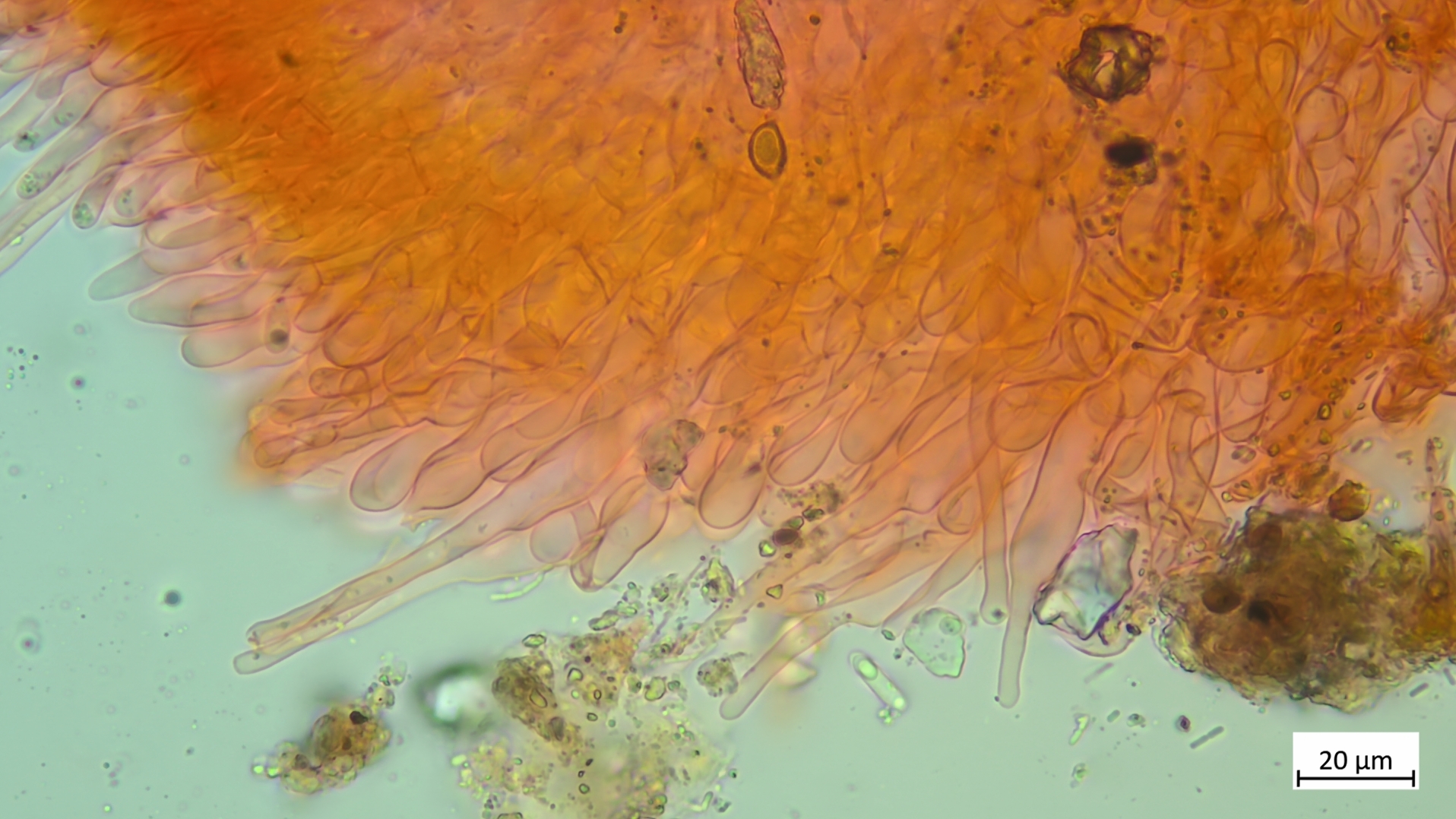 Kaulozystiden typisch keulig, Hyphen leicht inkrustiert (400-fach, Kongorot/SDS):