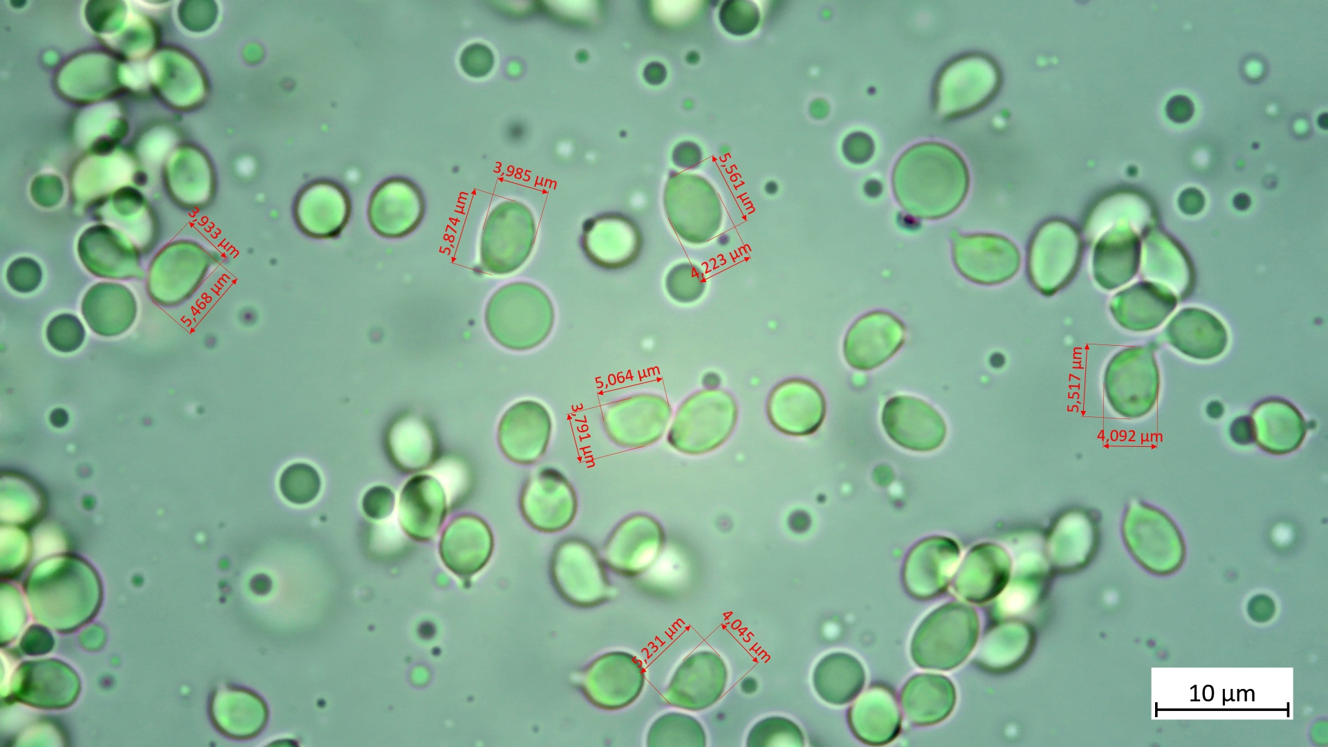 7,6-8,2 µm (av. 7,9 µm, SD 0,2 µm) x 6,2-6,8 µm (av. 6,5 µm, SD 0,2 µm); Q = 1,2-1,3 (av. 1,2, SD 0,1)(n = 5)