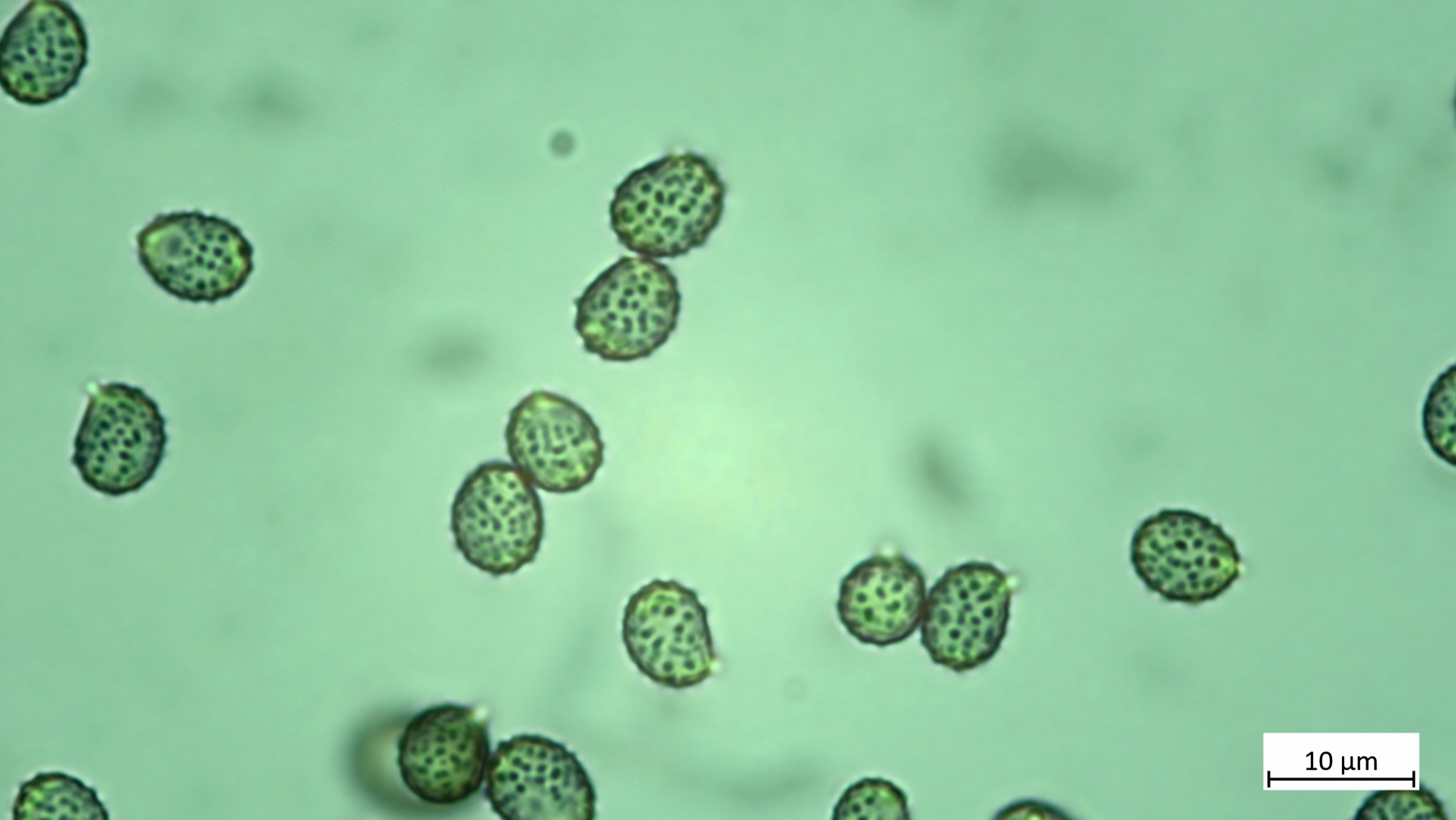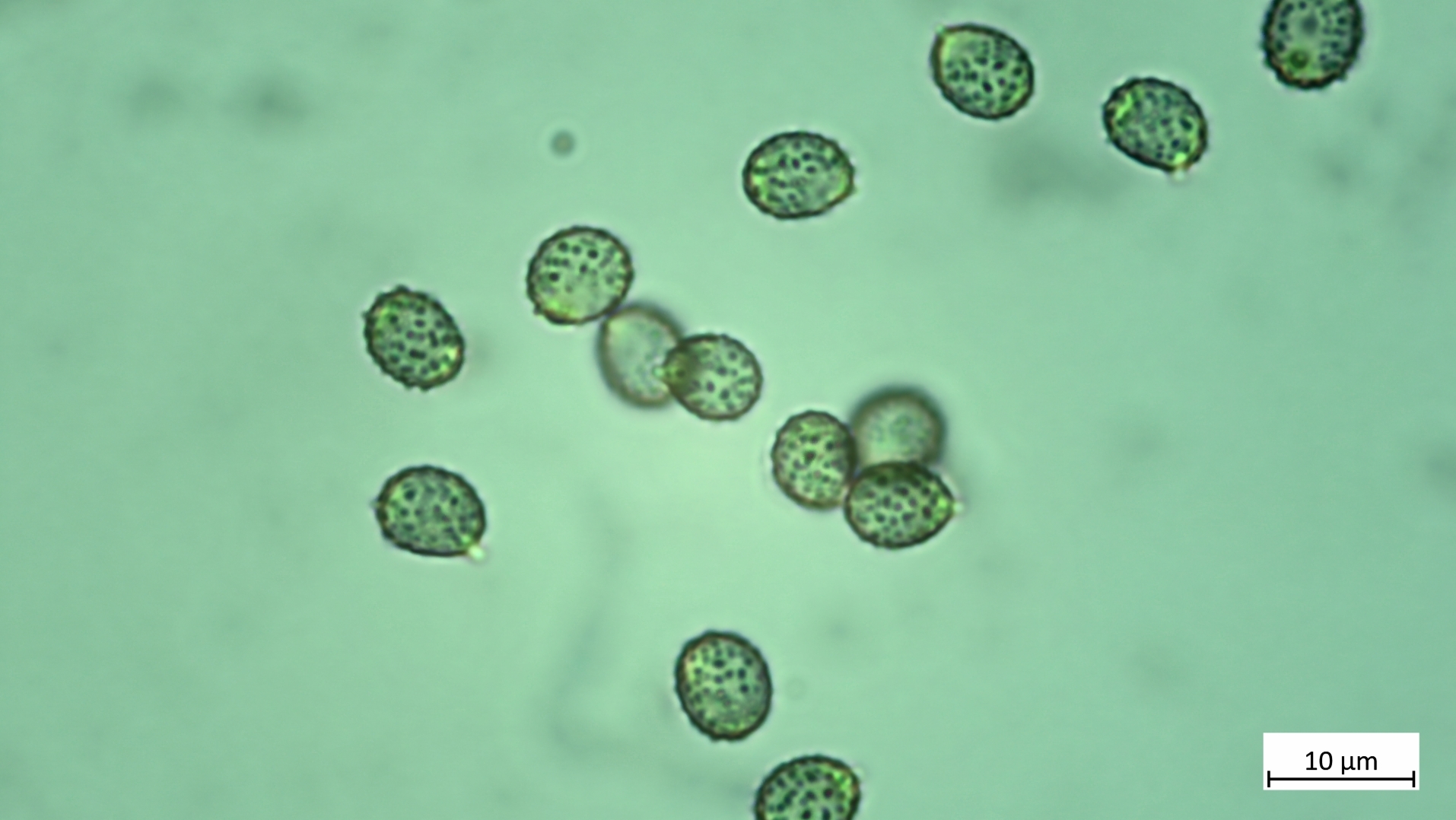 Sporen inamyloid (hier in Melzer): 5,1-5,9 µm (av. 5,5 µm, SD 0,3 µm) x 3,8-4,2 µm (av. 4,0 µm, SD 0,1 µm); Q = 1,3-1,5 (av. 1,3, SD 0,1)(n = 6)