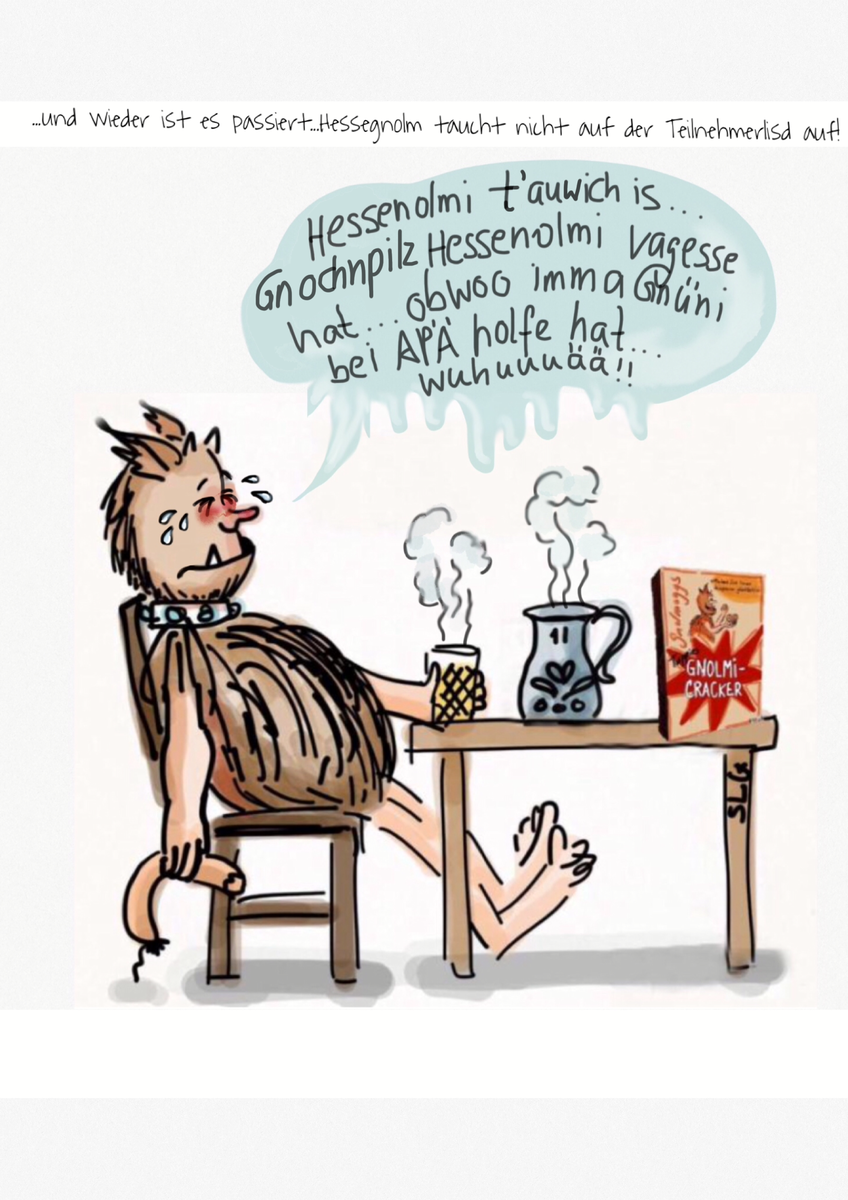 Gnolmi: "Wuäääääh! Hessenolmi ganet mea mitspiel wenn vagesse! Gnochnpilz Hessenolmi doch kenn! Un Hansenolmi au Kumbel von Hessenolmi is...wuuuääääh...schnief...schluchz..."
