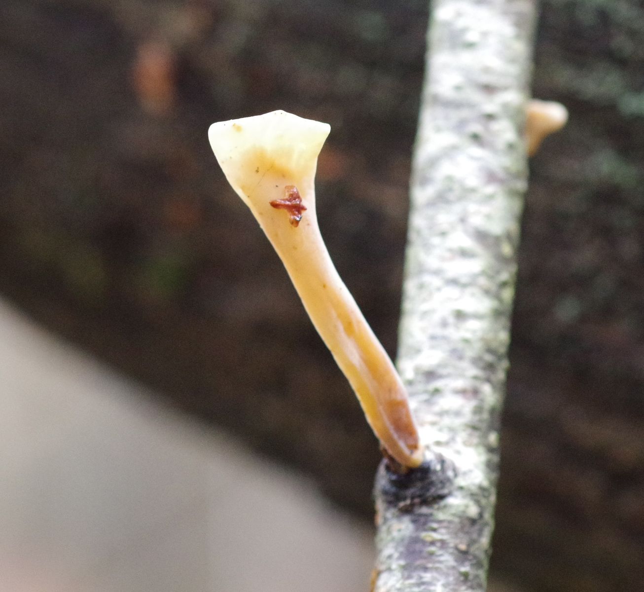aus einem älteren Laubwald stammt dieser Pilz an einem abgebrochenen Zweig (wohl Birke) in vielleicht 1,5 m Höhe. Der beigefarbige Pilz ist etwa 4 cm lang, und sieht aus wie man das von einem "Spatelpilz" erwarten würde, nur finde ich da keine Art die an Holz wächst und in Osteuropa. Spathularia rufa sieht ja farblich ganz gut aus, wächts aber wohl auch nur auf dem Boden. Das Foto ist leider miserabel, ich hoffe der hält sich bis zum Tageslicht.