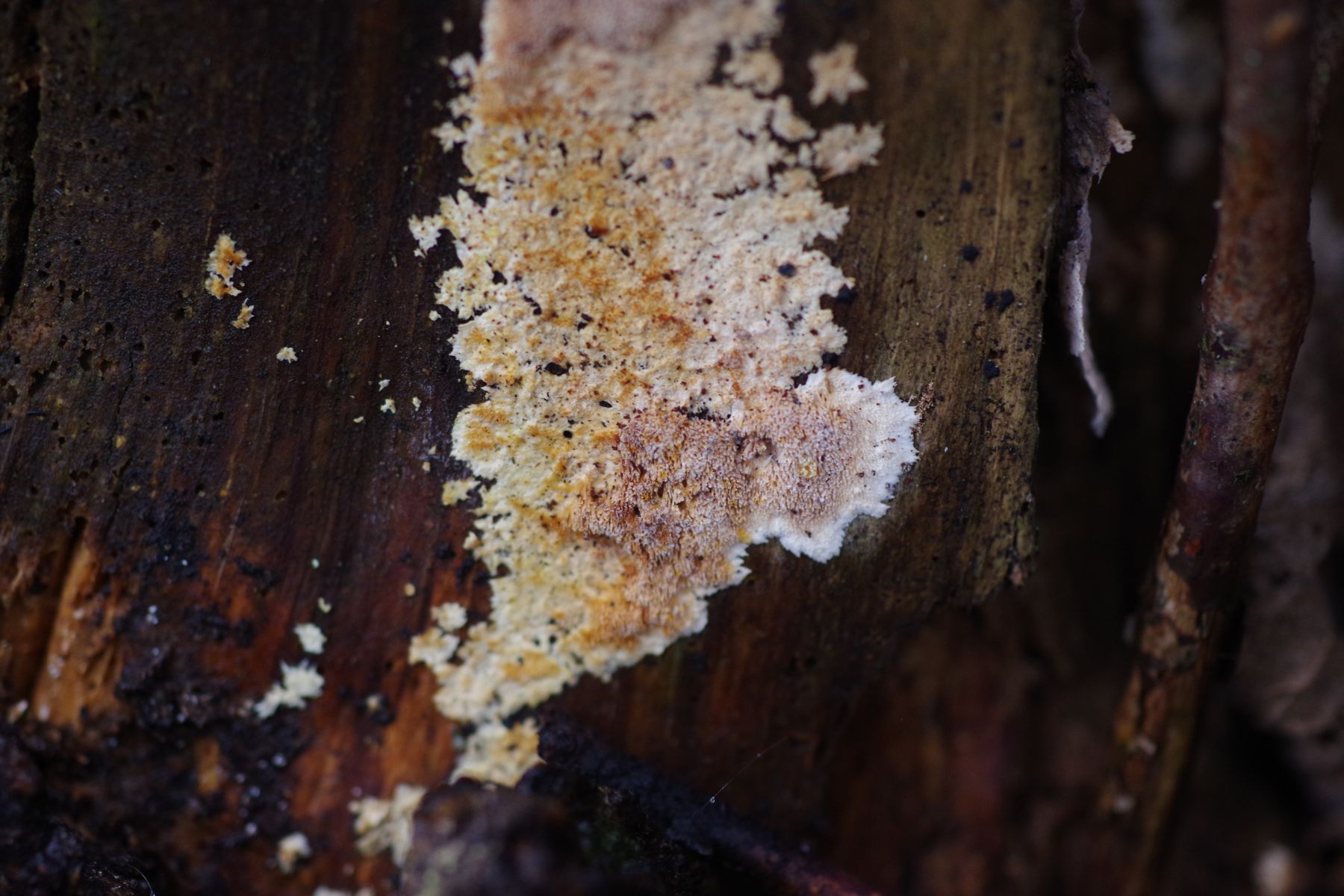 1) am sehr morschen Stubben einer abgebrochenen älteren Fichte wächst dieser orange Stachelpilz, der sehr an Sarcodontia setosa erinnert, nur in kleineren Portionen wächst. Vielleicht kommt auch Dentipellis in Frage. Geruch unauffällig, auf KOH keine Verfärbung.