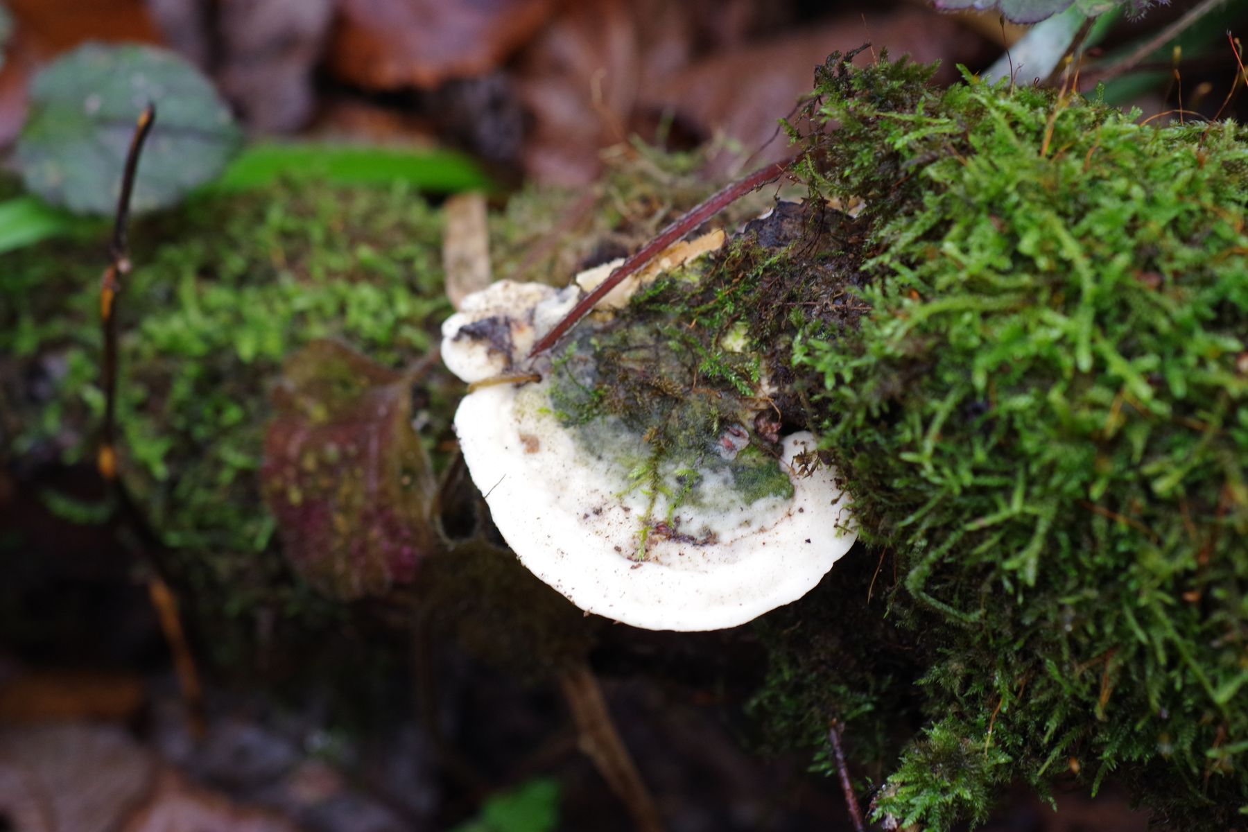 2) eine mehrjährige Tramete an einem dünneren umgefallenen Stamm einer Feldulme. Bis 10 cm breit. Die hätte ich als Trametes gibbosa angesprochen, wären da nicht die deutlich feinerern Poren. Alos, keine Ahnung.