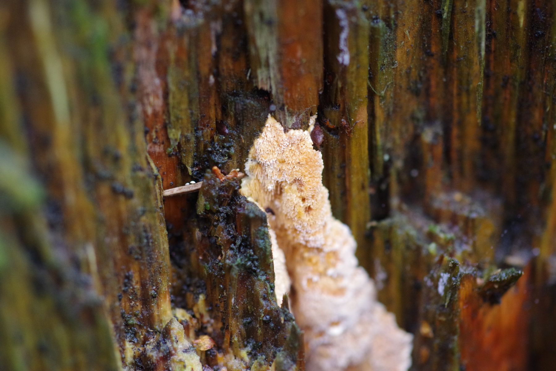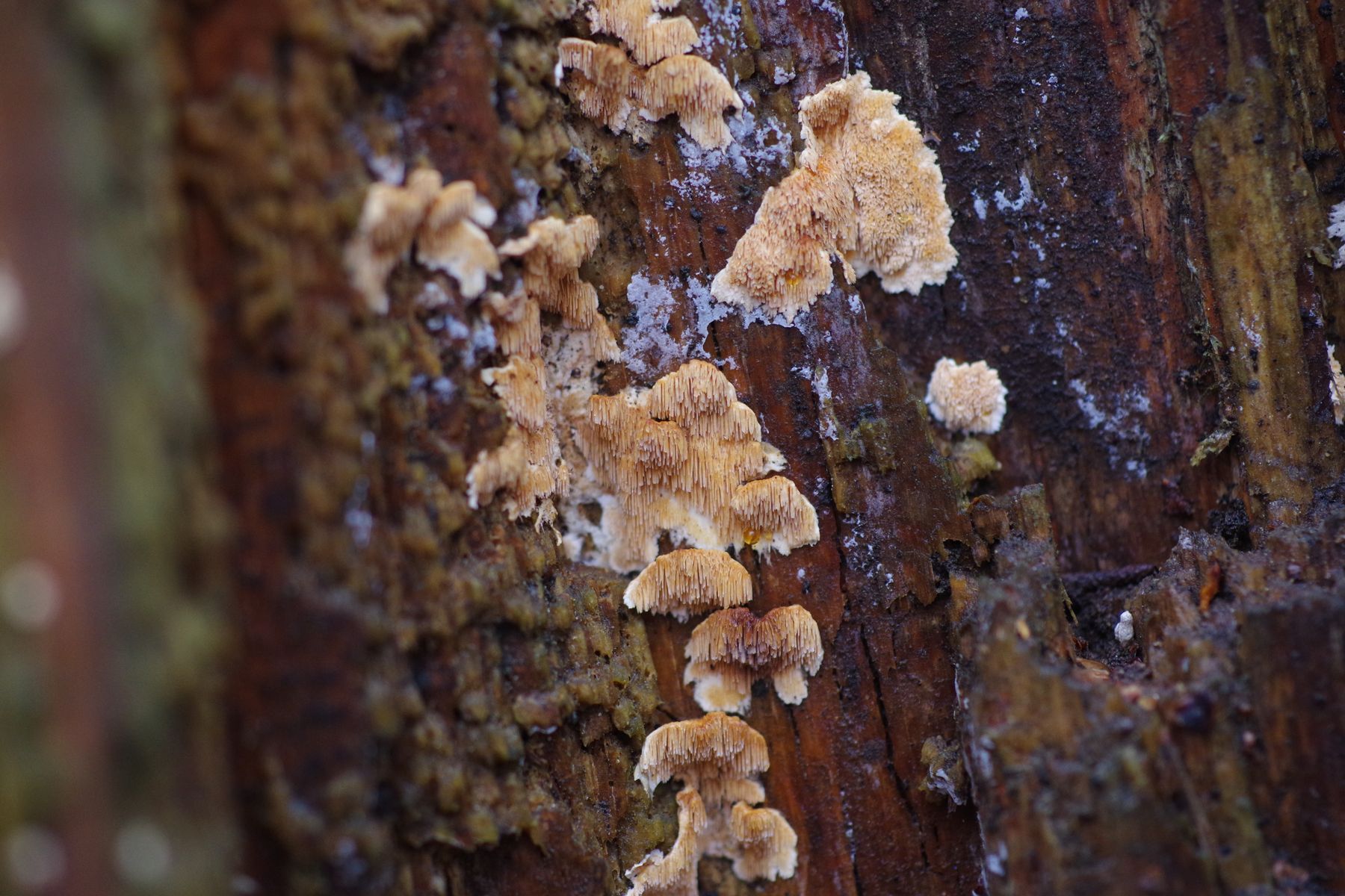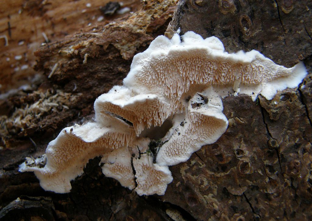 Unter 1) könnten auch zwei unterschiedliche Arten zu sehen sein, die sich das Substrat teilen. Das letzte Bild sieht schon nach einem Steccherinum aus (Steccherinum bourdotii habe ich auch schon mal an Nadelholz entdeckt!), aber die Bilder davor wirken eher wie ein Porling mit laceraten Poren, also durch die Wuchsweise an senkrechtem Substrat plattig bzw. zahnförmig aufspaltend. Schizopora - Arten machen solche Sachen, aber auch die in der Konsistenz weicheren Ceriporias zum Beispiel.