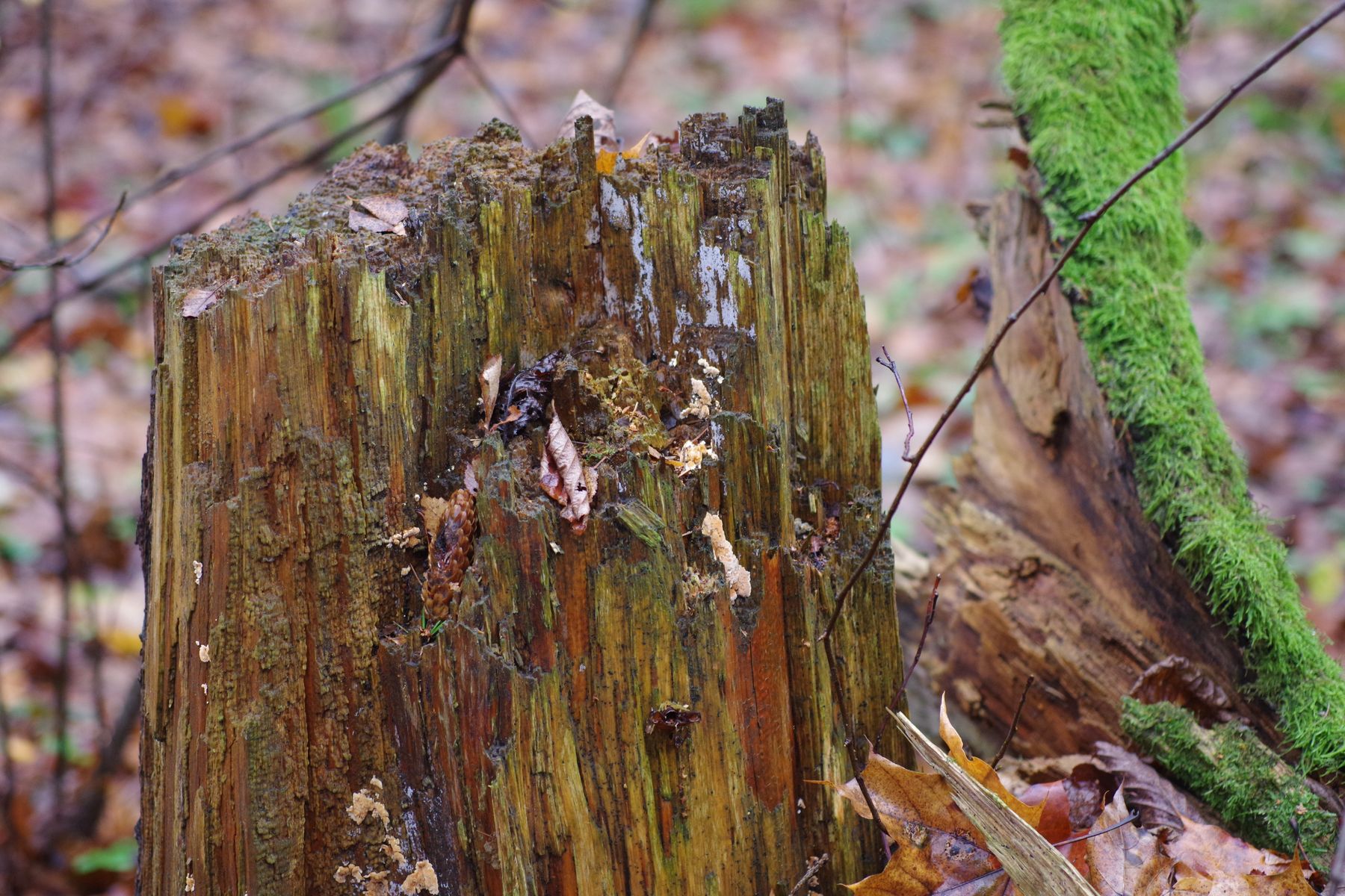 1) am sehr morschen Stubben einer abgebrochenen älteren Fichte wächst dieser orange Stachelpilz, der sehr an Sarcodontia setosa erinnert, nur in kleineren Portionen wächst. Vielleicht kommt auch Dentipellis in Frage. Geruch unauffällig, auf KOH keine Verfärbung.