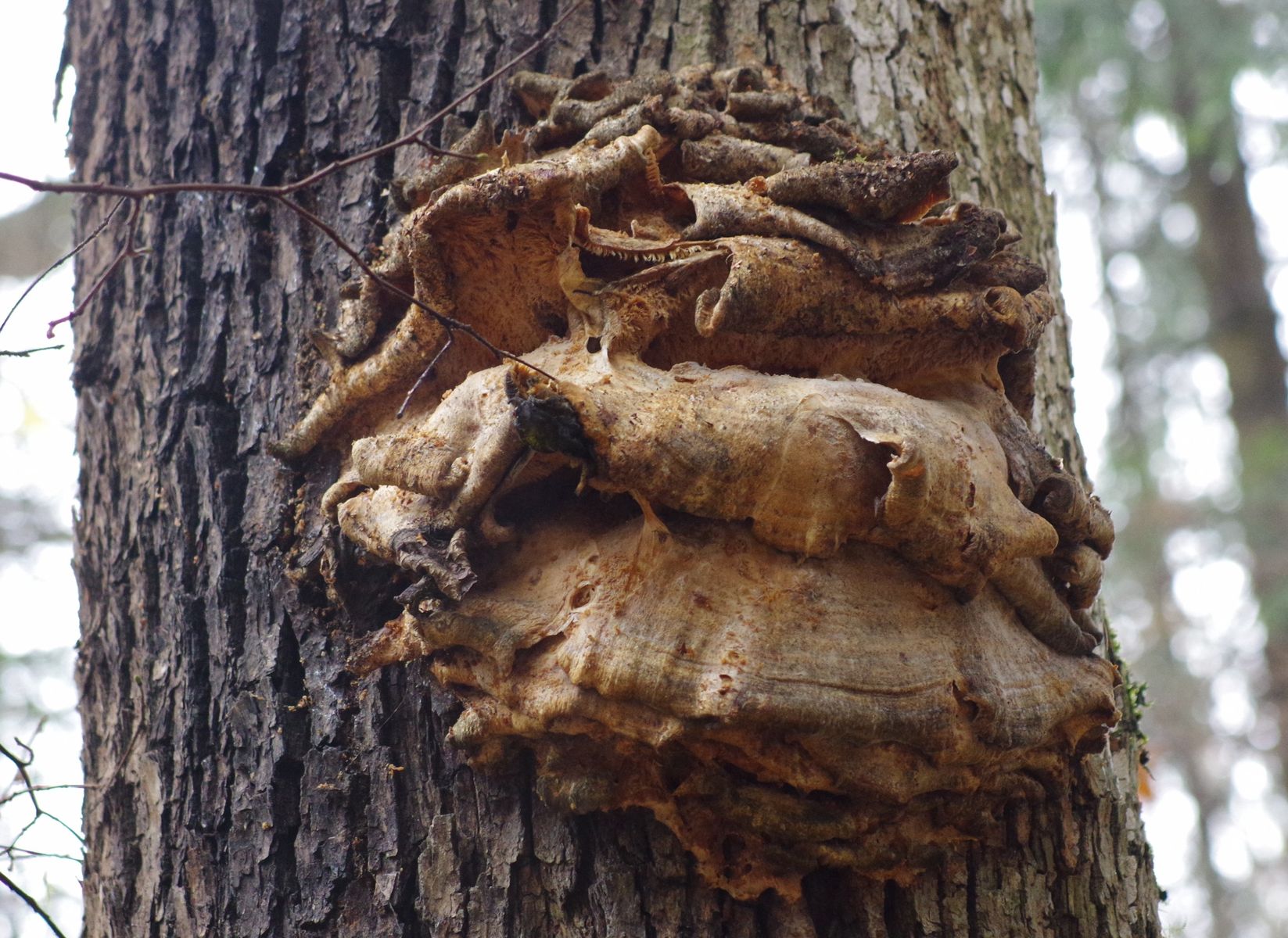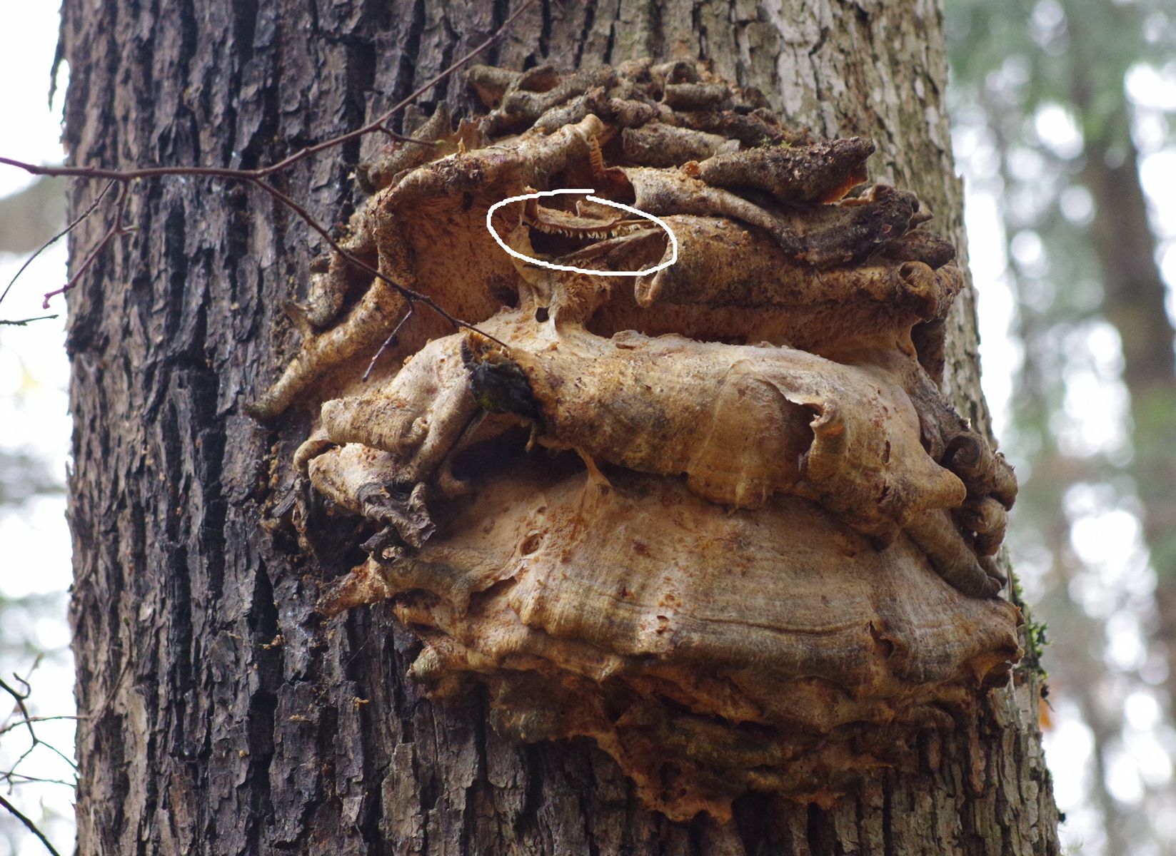 3) und schließlich noch an einem Ahorn in vielleicht 3 m Höhe dieses vergreiste Büschel, auf das ich mir zunächst keinen Reim machen konnte, aber auf den Fotos sieht man zahnartige Strukturen, womit ich bei Climacodon septentrionalis bin.