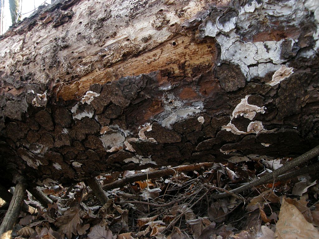 2) eine mehrjährige Tramete an einem dünneren umgefallenen Stamm einer Feldulme. Bis 10 cm breit. Die hätte ich als Trametes gibbosa angesprochen, wären da nicht die deutlich feinerern Poren. Alos, keine Ahnung.