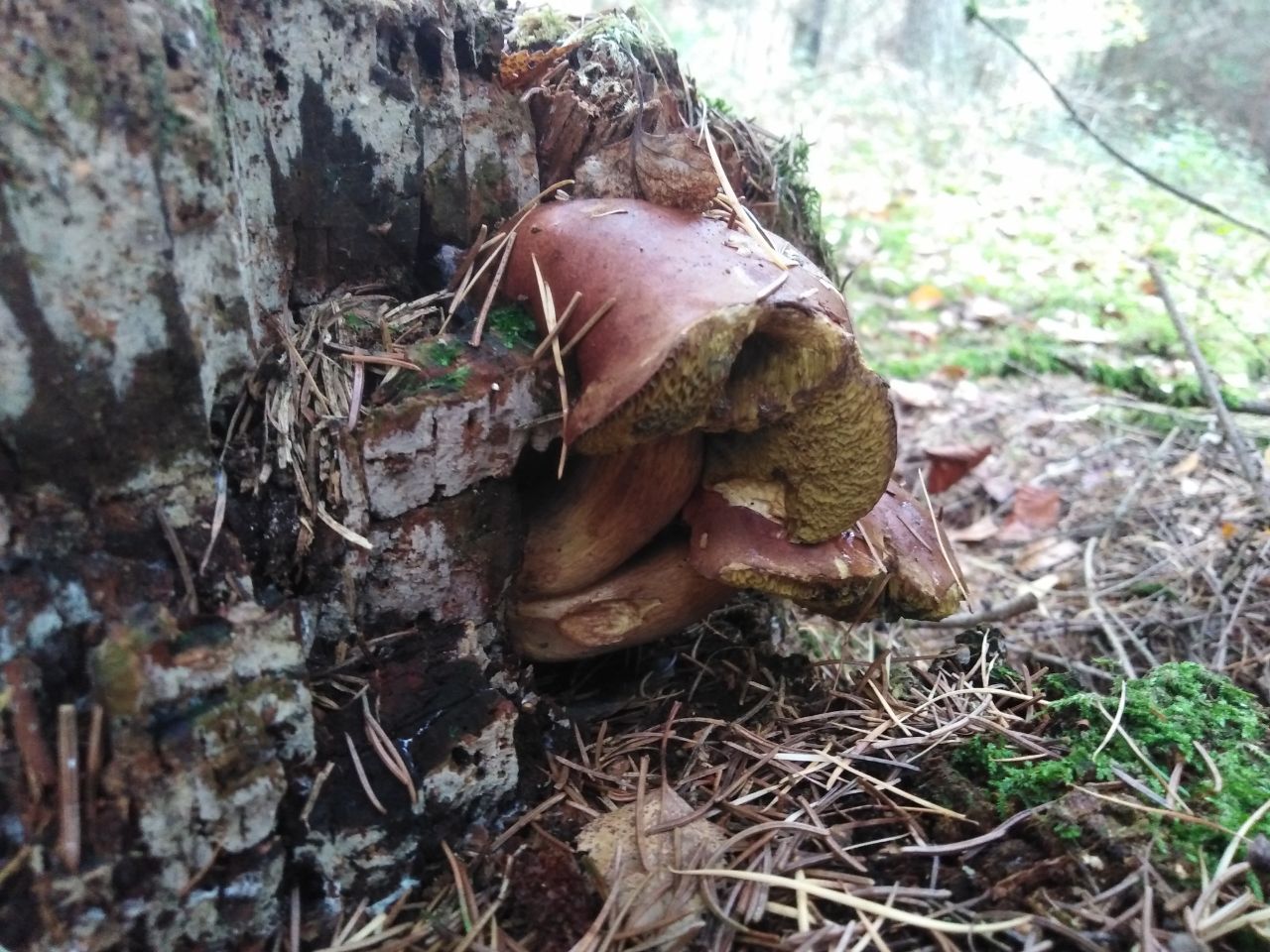 Und auch bei dem Röhrling heute auf dem Baumstumpf handelt es sich nach meinem Ermessen eventuell um einen Rotfußröhrling, und zwar um einen Stattlichen. Wobei ich mir da garnicht sicher bin, weil die Hutfarbe sehr kastanienmäßig aussieht, und auch haptisch eher glatt. Der recht stark verwitterte Baumstumpf war vermutlich der einer Fichte, und es befanden sich drei bereits etwas in die Tage gekommene Exemplare darauf. Am Rand einer Fichtenkultur. Wahrscheinlich nix so besonderes, aber ich würde Röhrlinge eigentlich nicht unbedingt auf Totholz suchen.