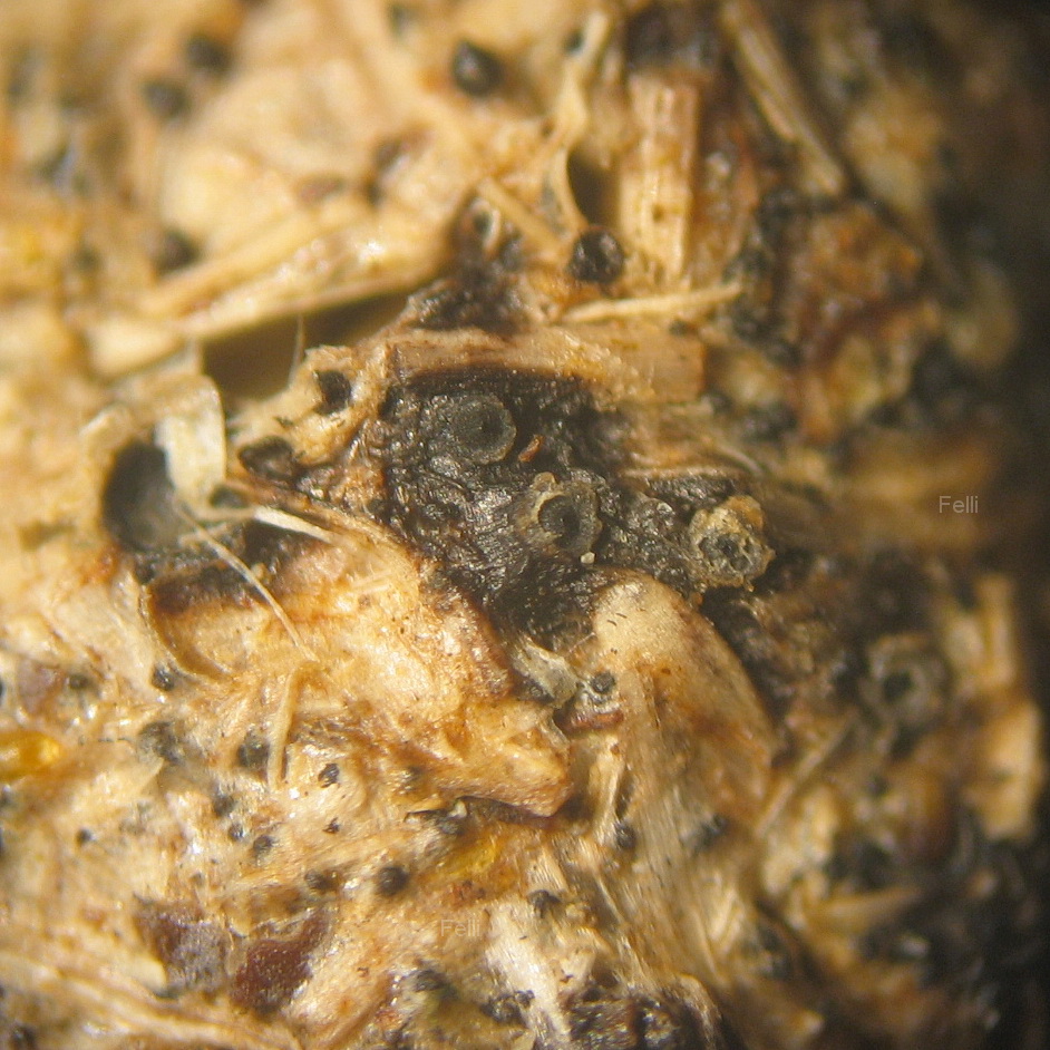 • Lieber Felli, der Filz (Tomentum) befindet sich (wenn vorhanden), anders als bei Delitschia, auf dem Stroma. Das ist die harte Schicht über dem Perithecium. Frage mich, wie du den FK aus dem Substrat heraus bekommen hast? Normalerweise ist das Substrat so verdichte, dass das kaum möglich ist. Die Perithecienwand ist ja sehr dünn und verletzlich, so dass sich der Pilz offenbar vor dem austrocknen schützen will. Übrigens bin ich an Belegen sehr interessiert. Gruß Peter