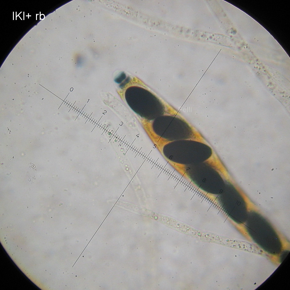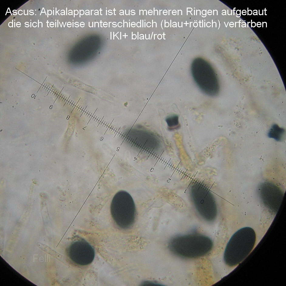 Die Lugol (IKI) - Reaktion ist sehr schön und zeigt einen mehrschichtigen Apikalapparat der sich in der Färbung der einzelnen Ringen unterscheidet.