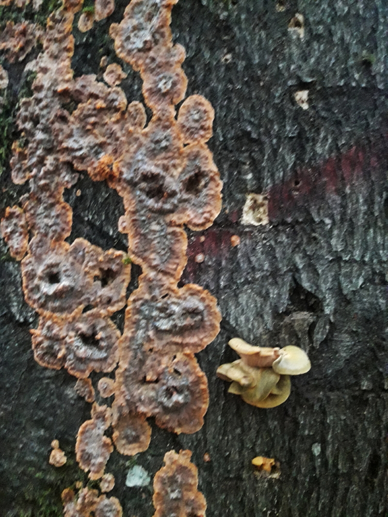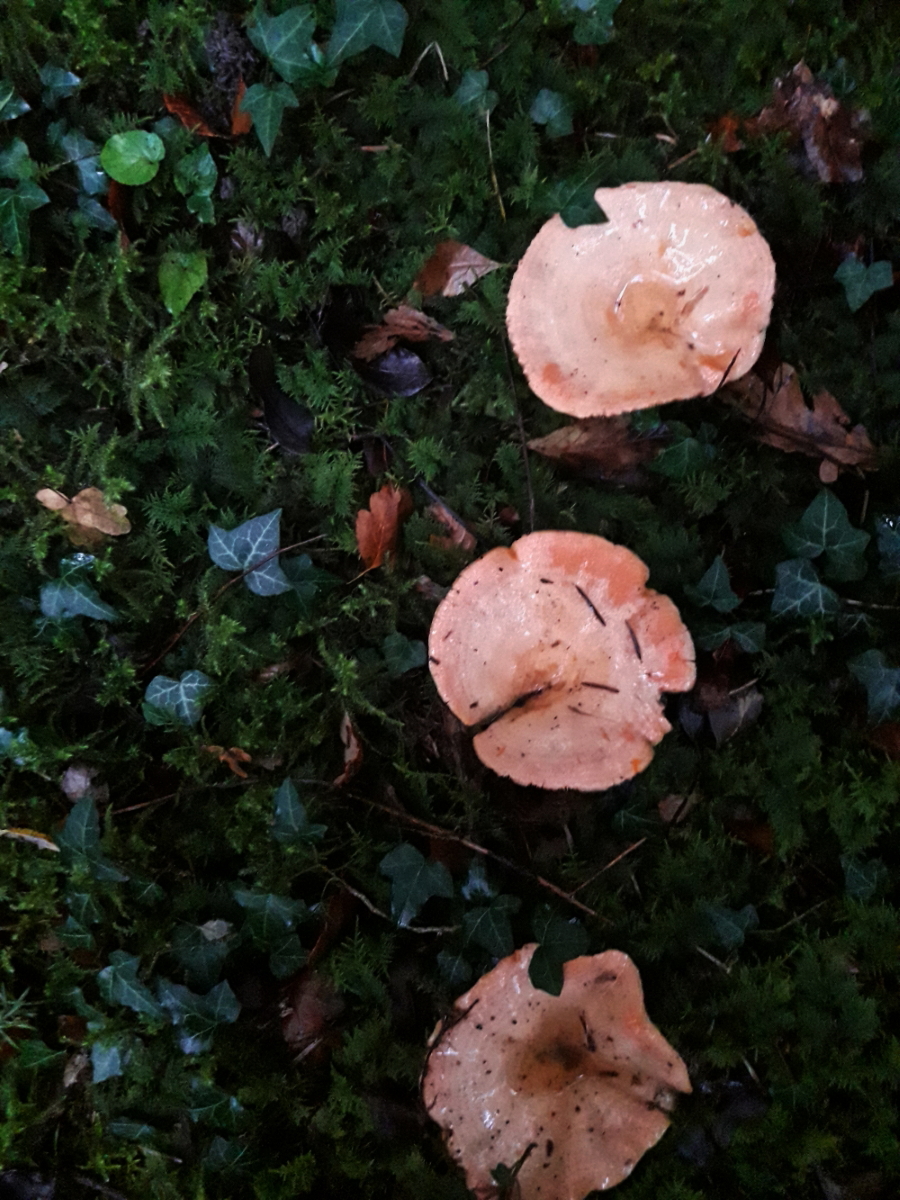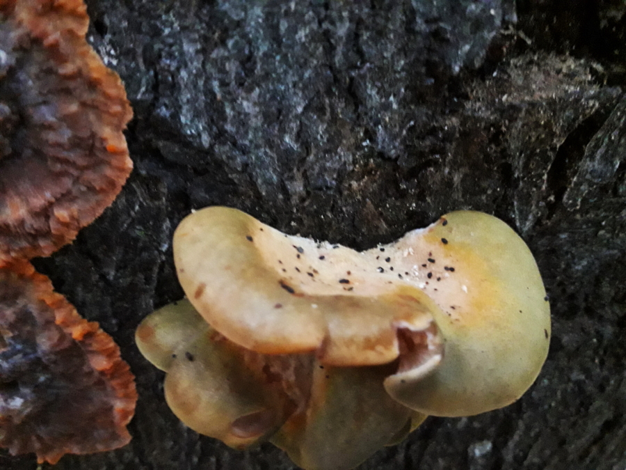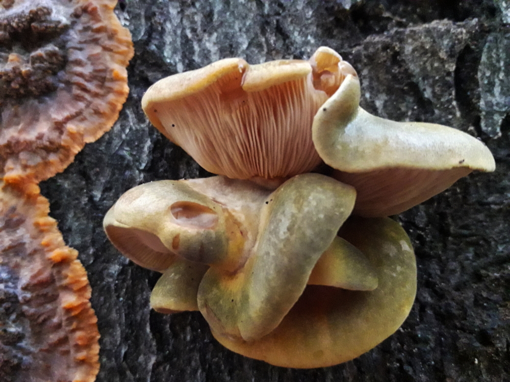 Nr. 7 Schöne Farben grün, orange, der kleine rechts, könnte der gelbstielige Muschelseitling sein, bei links keinen Plan