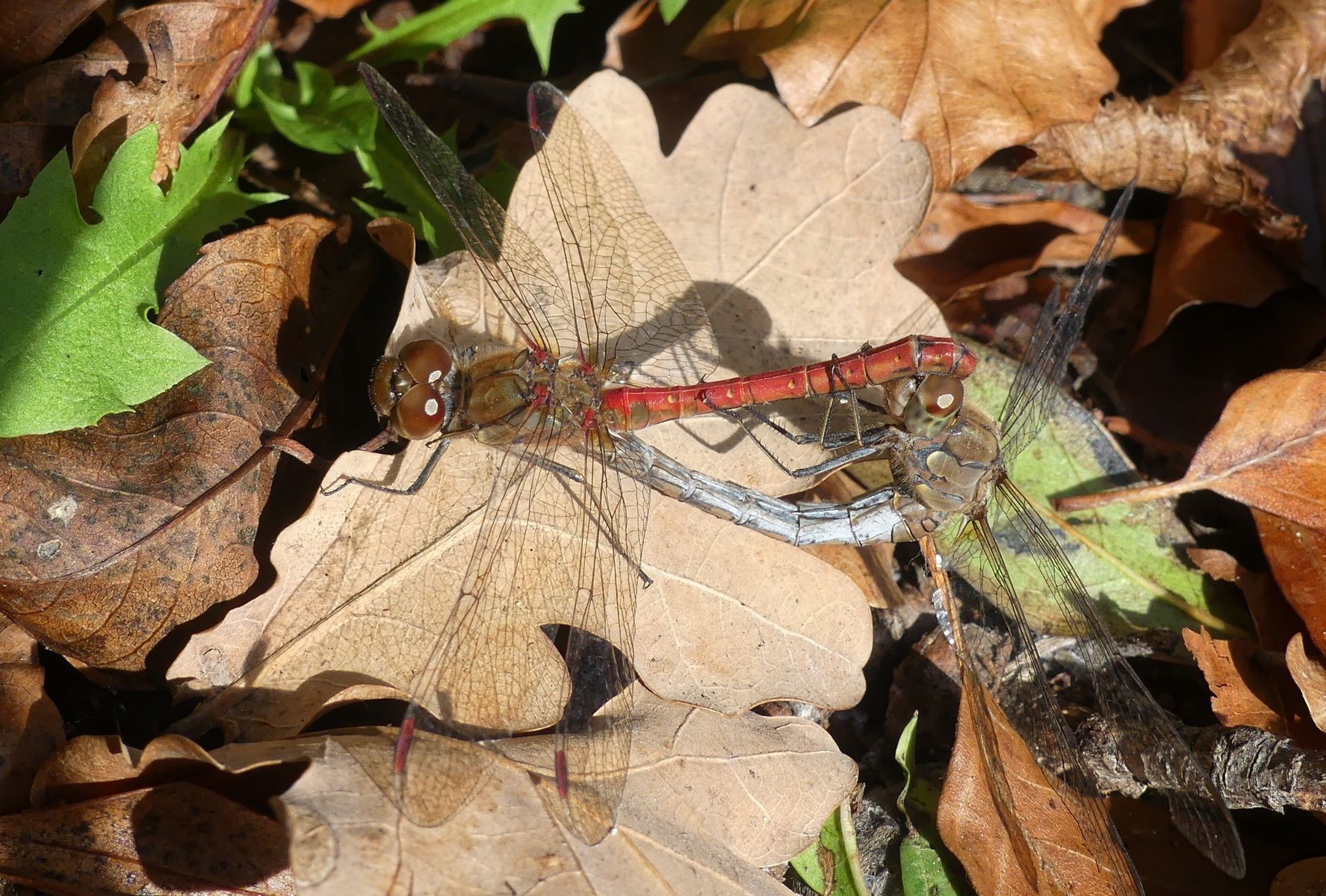 das Libellen-Paar ist die Gemeine Heidelibelle (Sympetrum vulgatum).