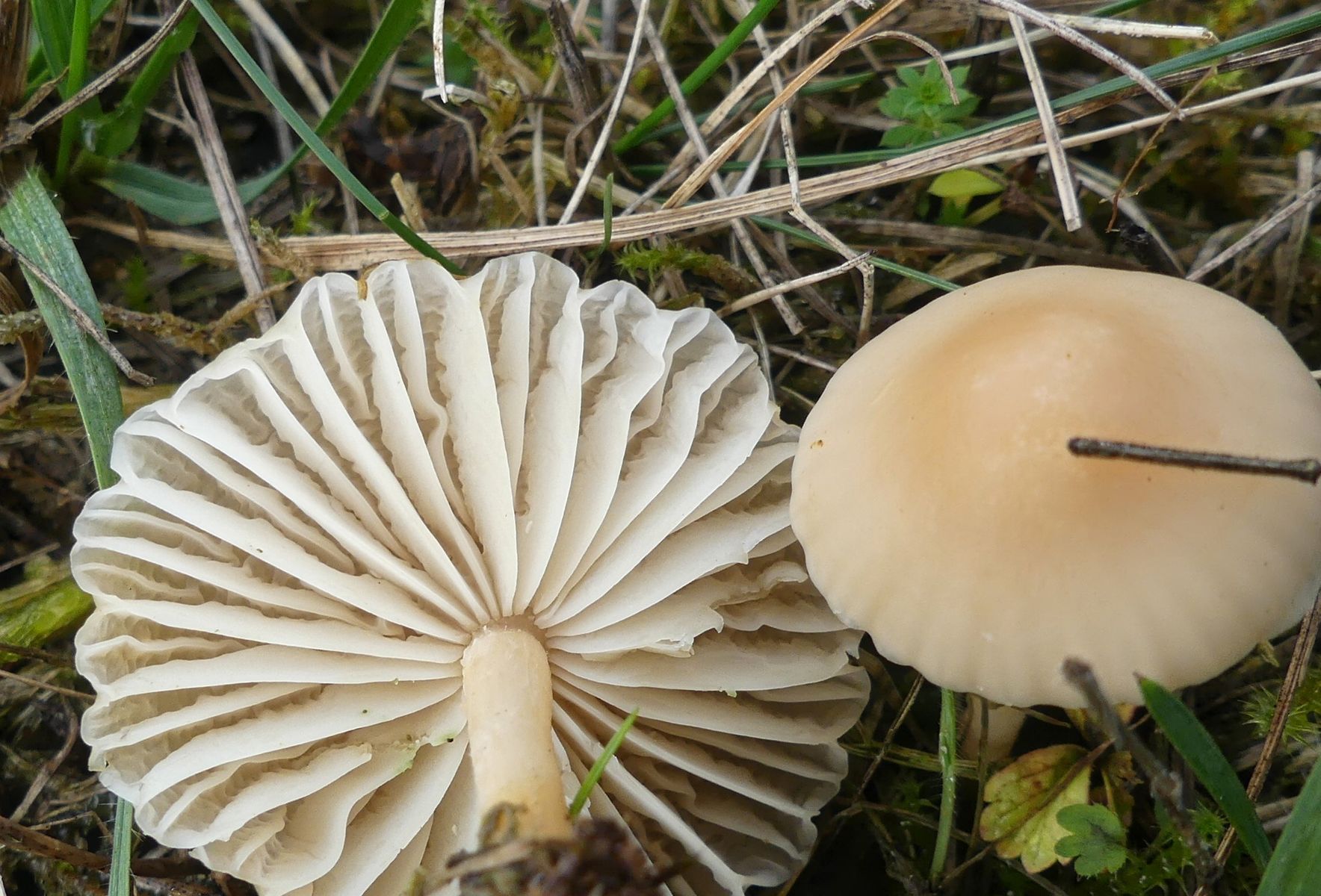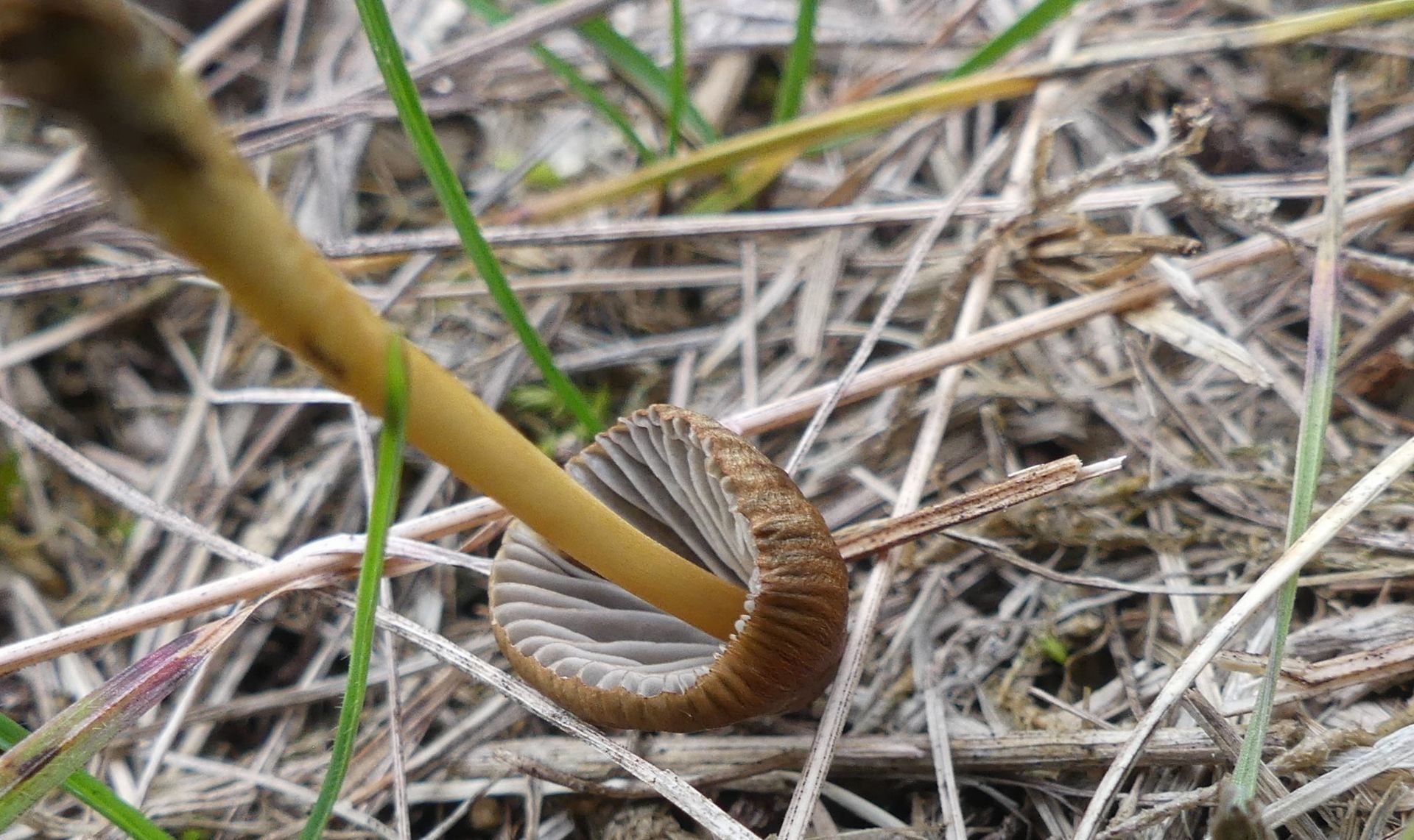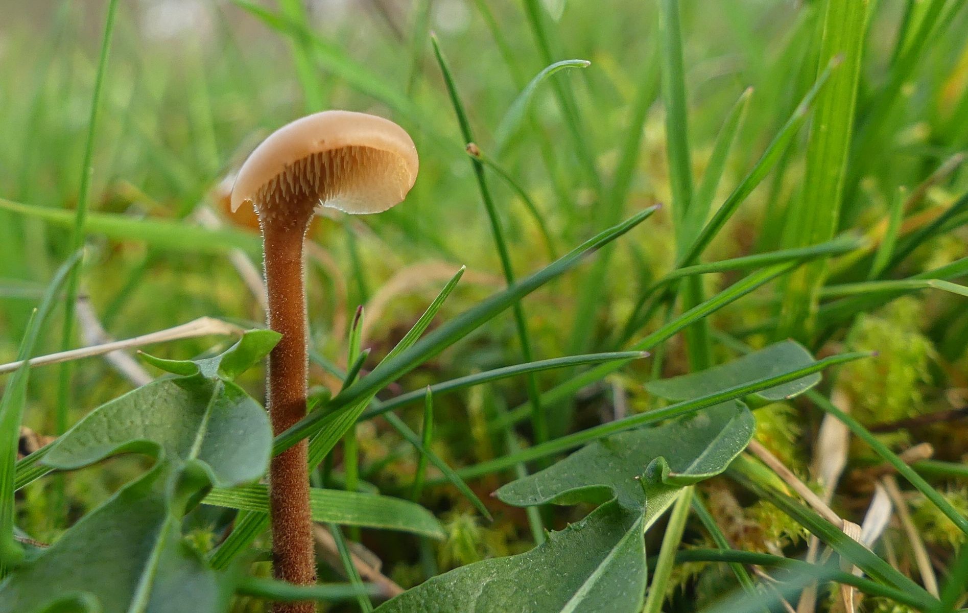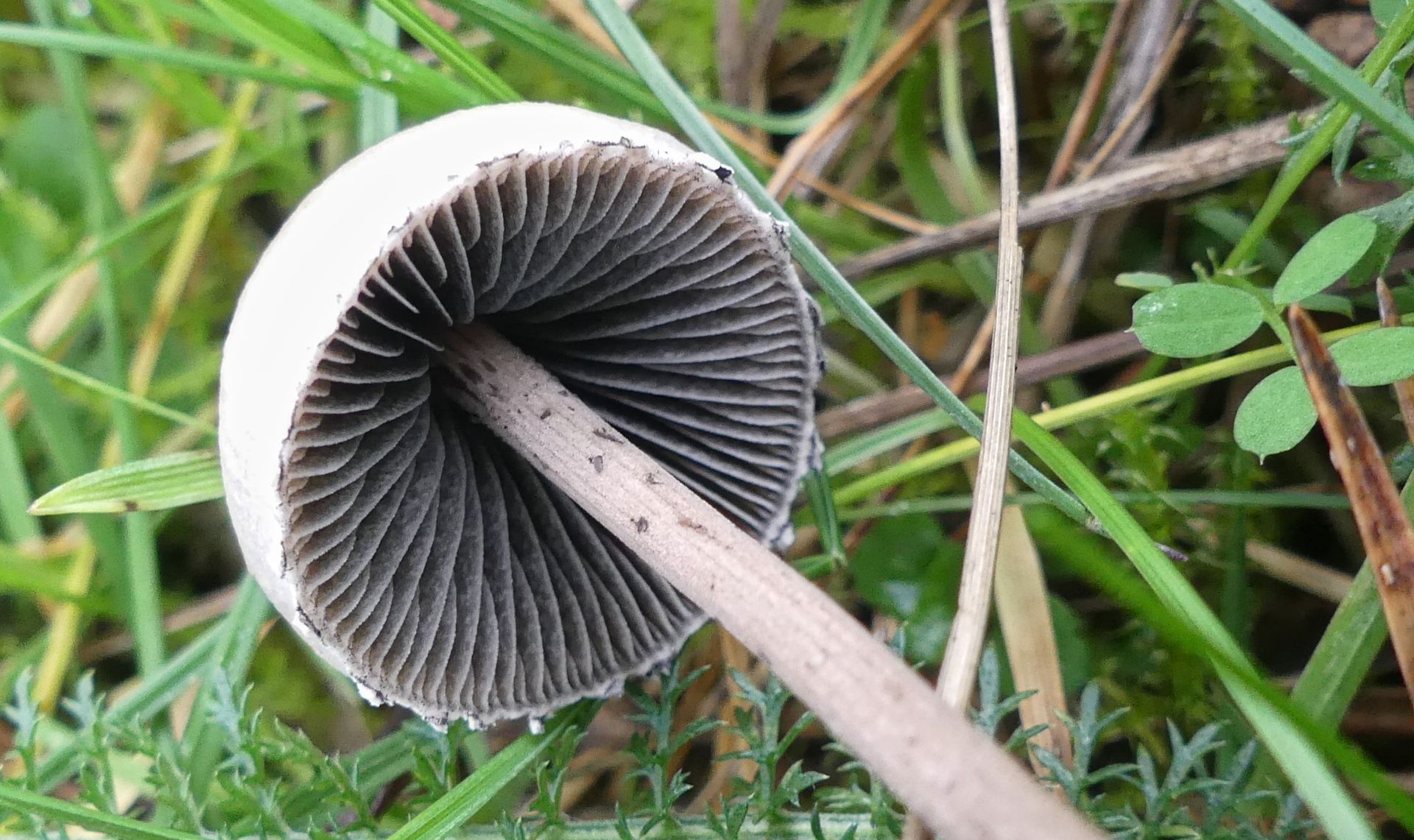 Es gab unendlich viele winzig kleiner Pilzchen und nachdem ich nicht fand was ich suchte sah ich mir eben die an. Ein paar der größeren der kleinen Pilzchen etwas genauer und mit denen "verlustierte" ich mich gestern Abend. Ich habe trotzdem nicht den Schimmer einer Ahnung - von diesem Hübschen mit seinen hellgrauen Lamellen hier zum Beispiel