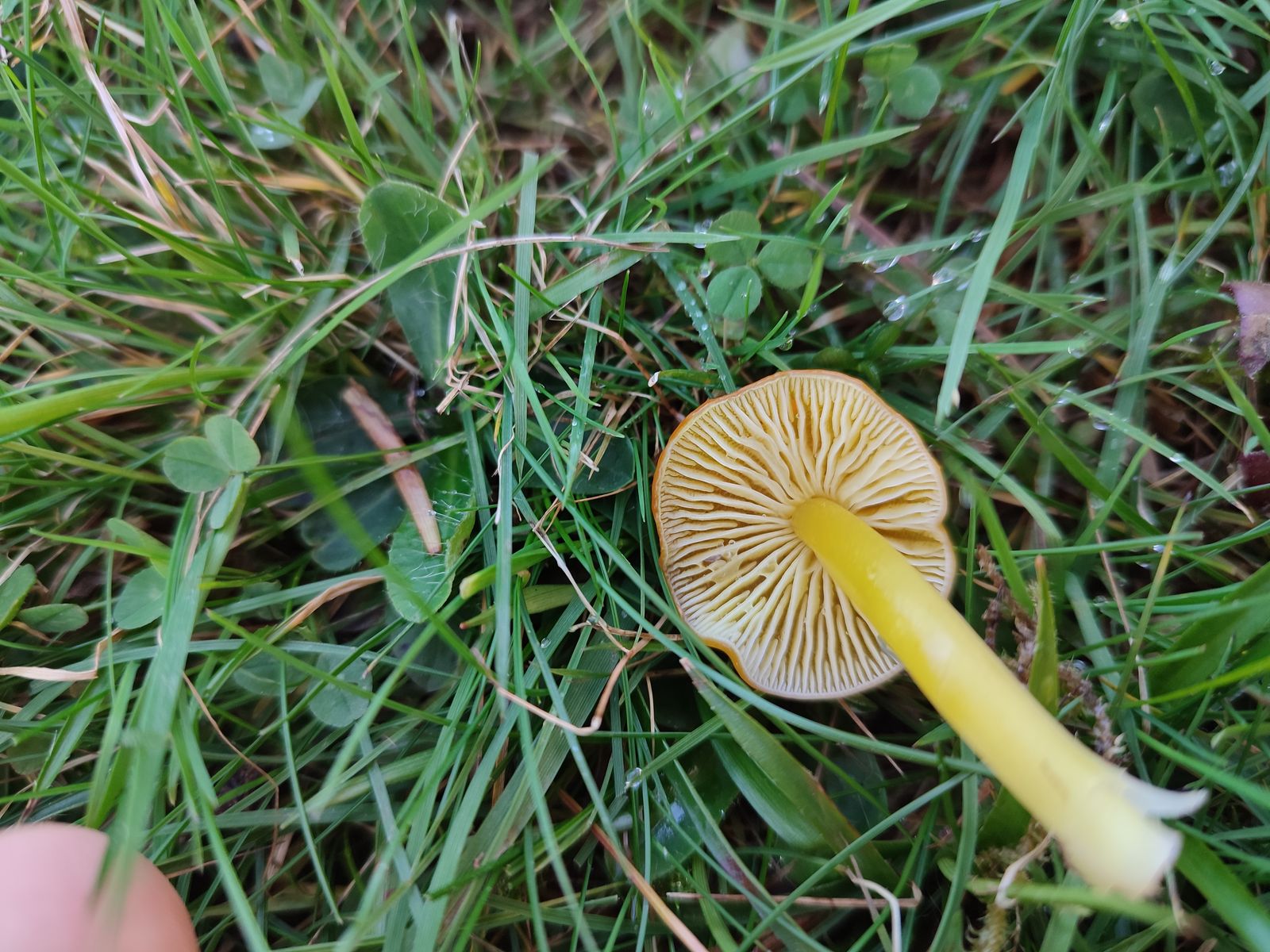 auf einer Wiese neben ein paar Wiesenellerlingen (Cuphophyllus pratensis) standen auch noch ein paar gelbe Saftlinge.