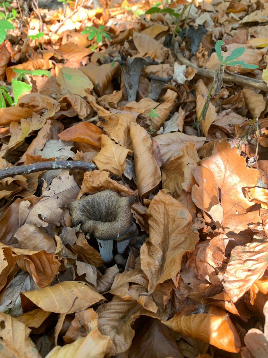 12. Ganz im Gegensatz zu ihrem Nadelwaldgegnstück, dem Trompetenpfifferling (Craterellus tubaeformis). Der steht hier immer noch in verschiedenem Alter als Massenpilz rum, selbst die, die unten schon total weiß sind, riechen übrigens noch angenehm, keine Spur von Ekelgeruch.
