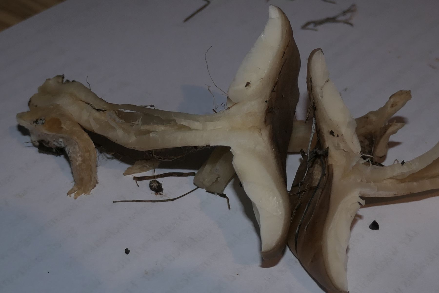 Stiel hohl, Spitze weißlich zur Basis hin hellbräunlich, zähes, faseriges Fleisch,