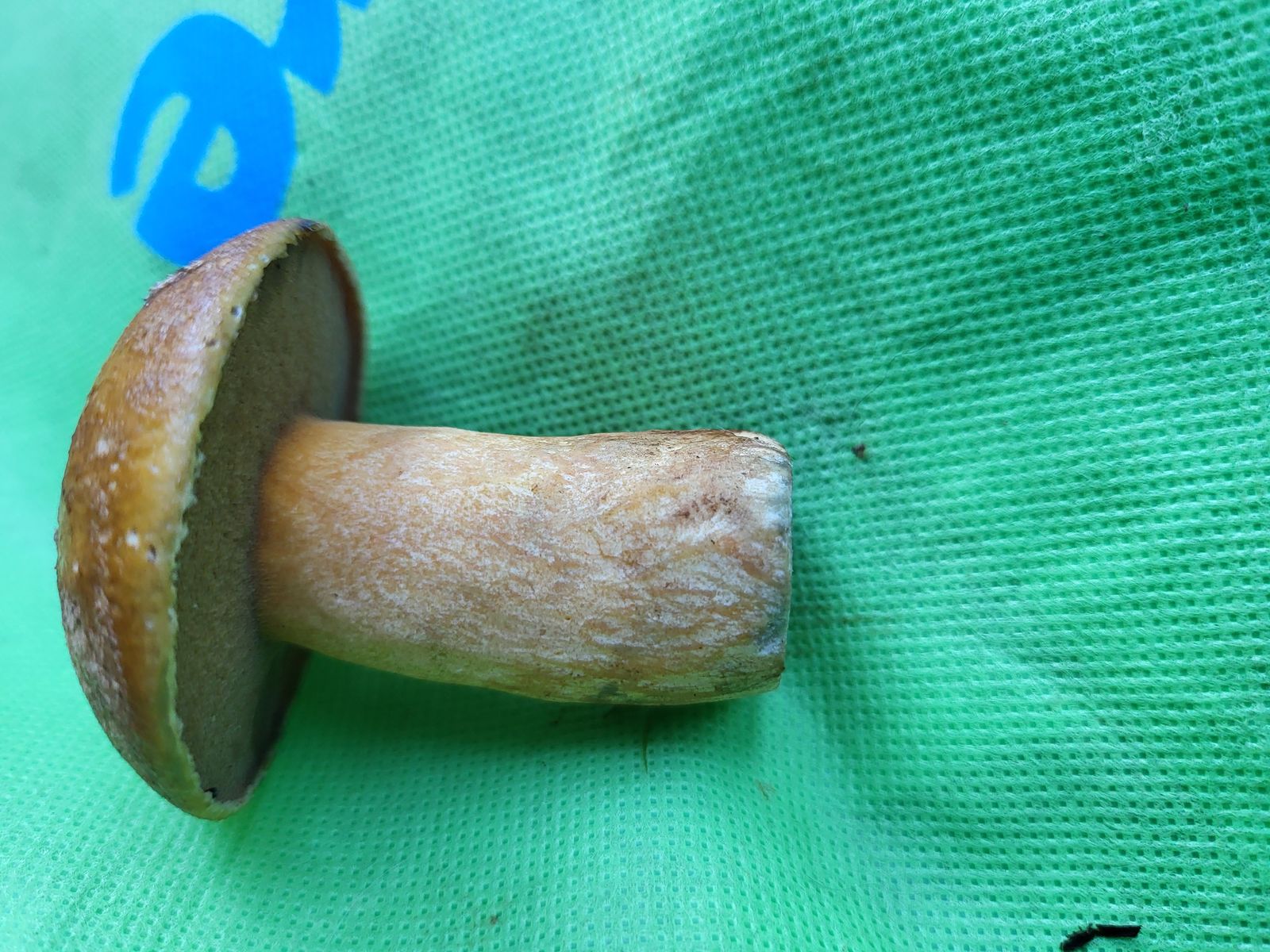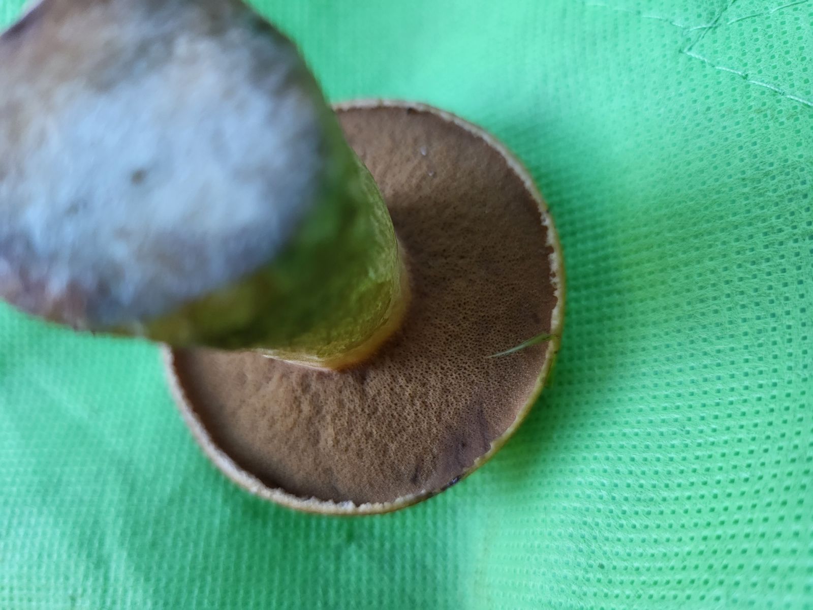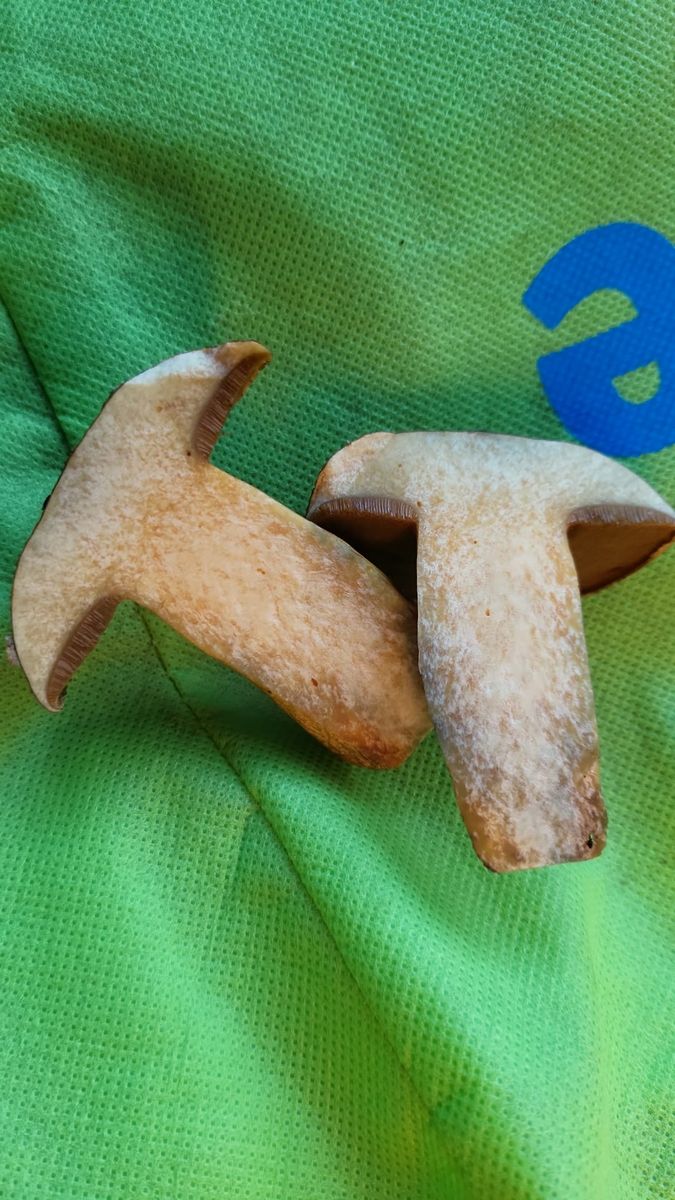 Der Schwamm ist sehr feinporig und sehr dünn und dunkel und der Stiel dick. Ich habe ihn aufgeschnitten mit der Zunge getestet. Schmeckt nicht bitter.. neutral..